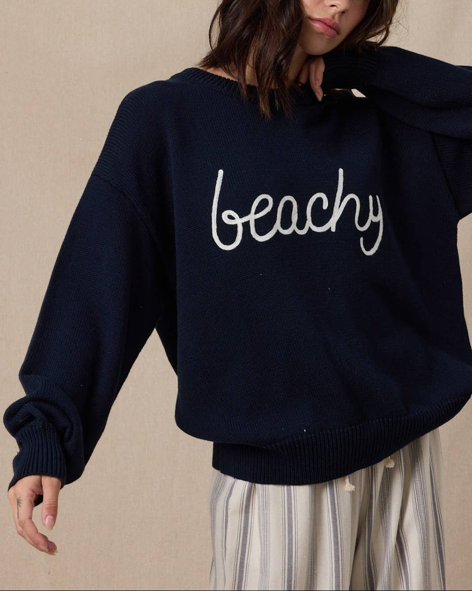 Easygoing with a playful coastal twist, the Gidget “Beachy” Drop Shoulder Sweater is made for relaxed days and effortless styling. Featuring soft “beachy” script embroidery across the front, this sweater brings personality without feeling overdone. The drop-shoulder silhouette and ribbed trim create a laid-back yet polished look that’s perfect for everyday wear.