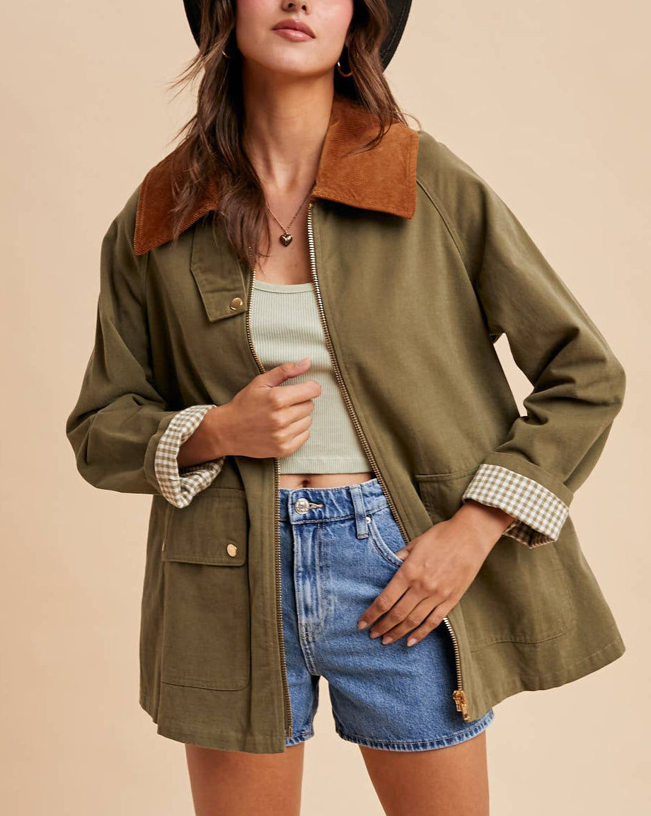 Your new favorite fall layer. The Katherine Chore Jacket in light olive combines soft cotton with classic workwear-inspired details. A corduroy collar and oversized patch pockets bring vintage charm, while gingham lining adds a playful twist. Designed to keep you warm and stylish all season.