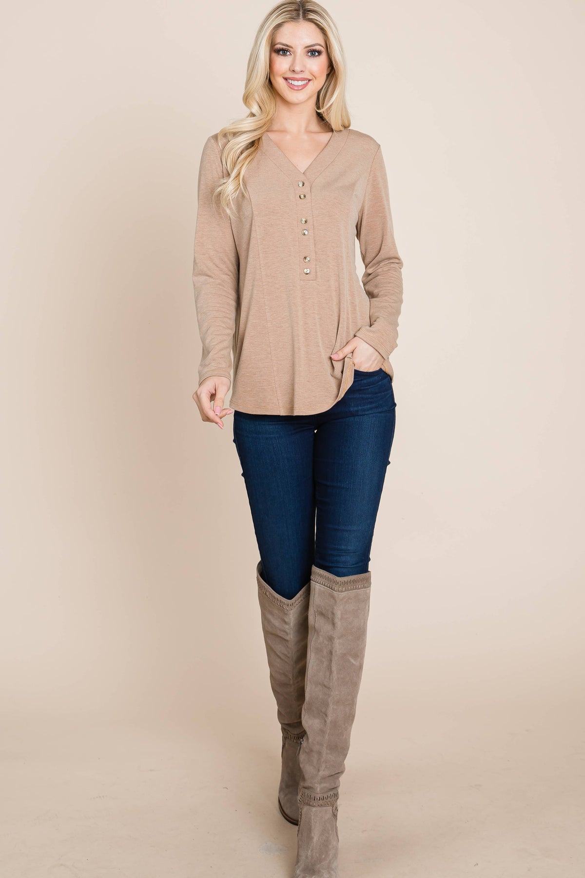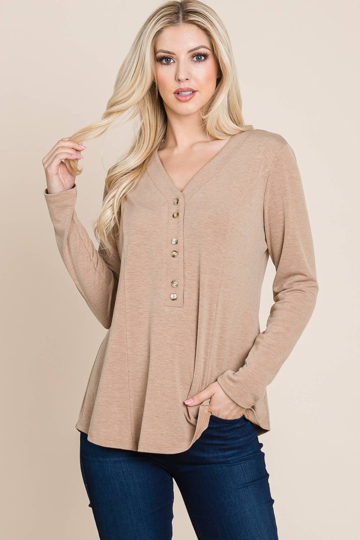 Embrace effortless style with this thoughtfully designed two-tone long sleeve top. Crafted from soft, luxurious fabric, it drapes beautifully while keeping you comfortable throughout your day. The refined v-neck and decorative button details add sophistication without sacrificing ease. Whether you're building a capsule wardrobe or refreshing your everyday basics, the complementary tone combination pairs seamlessly with everything you own. This is the reliable piece you'll reach for again and again, knowing it supports your lifestyle and your style.