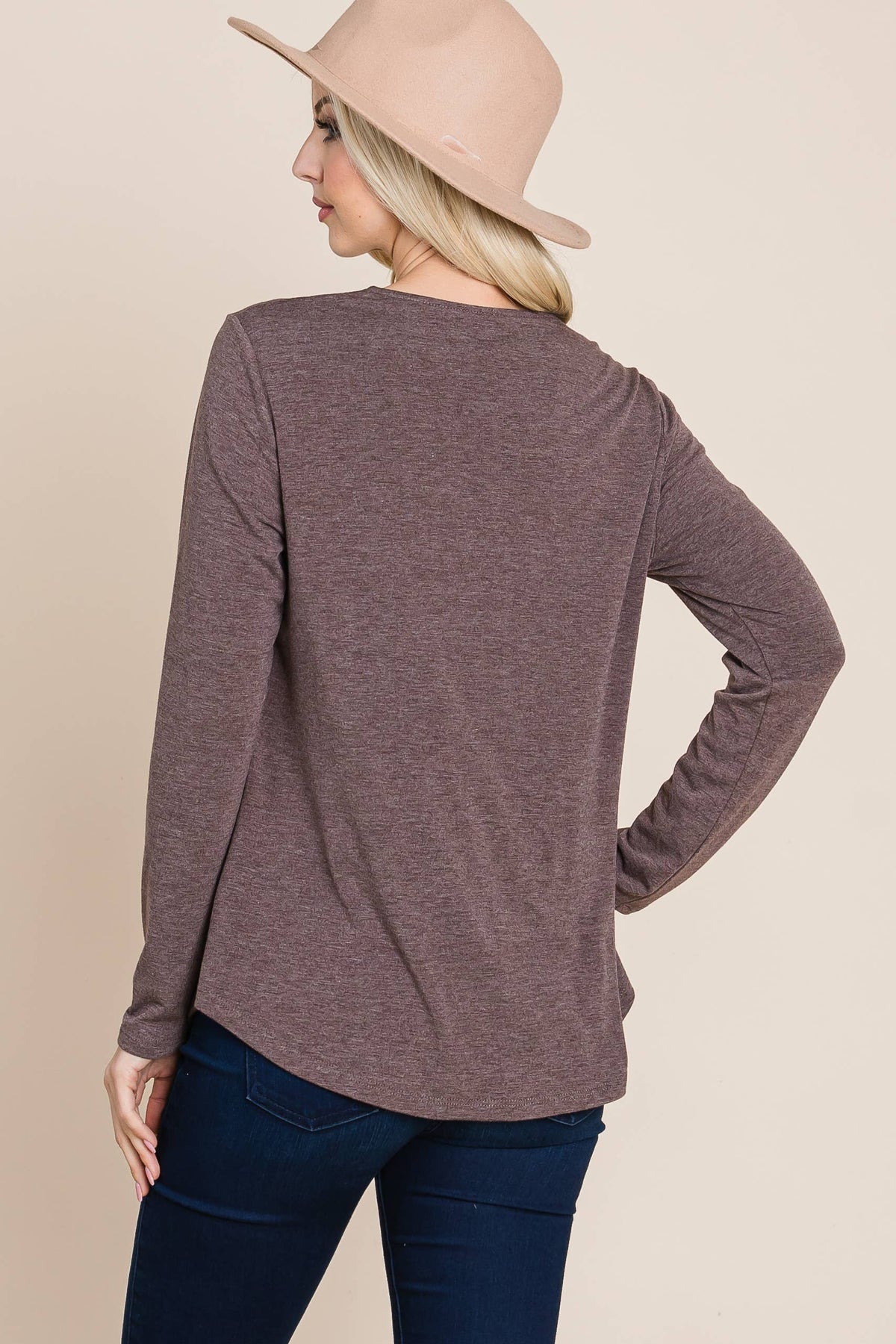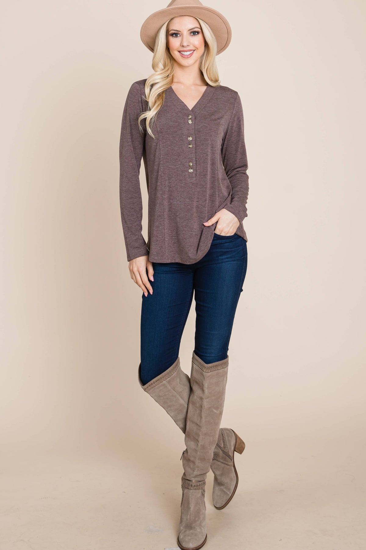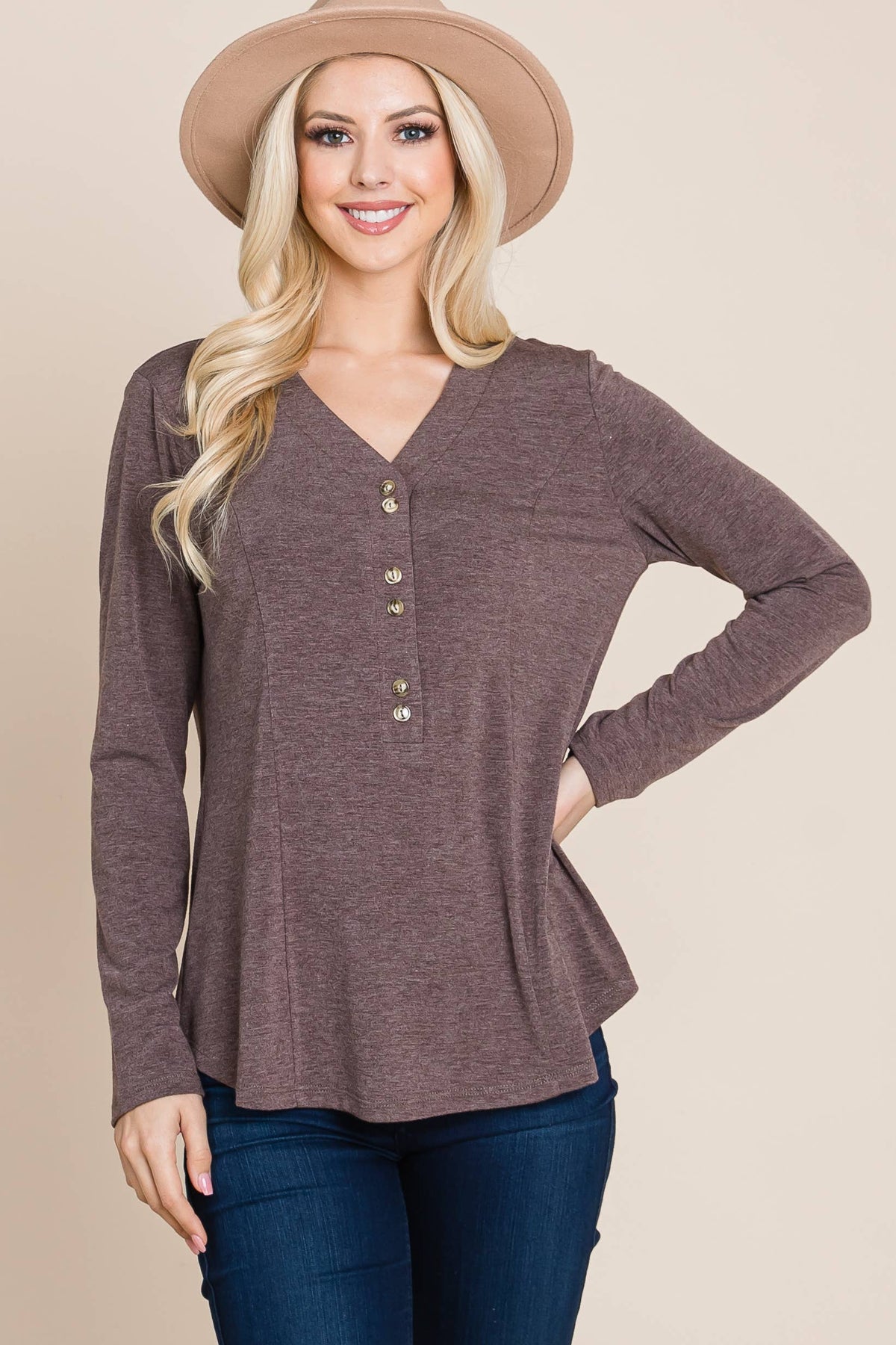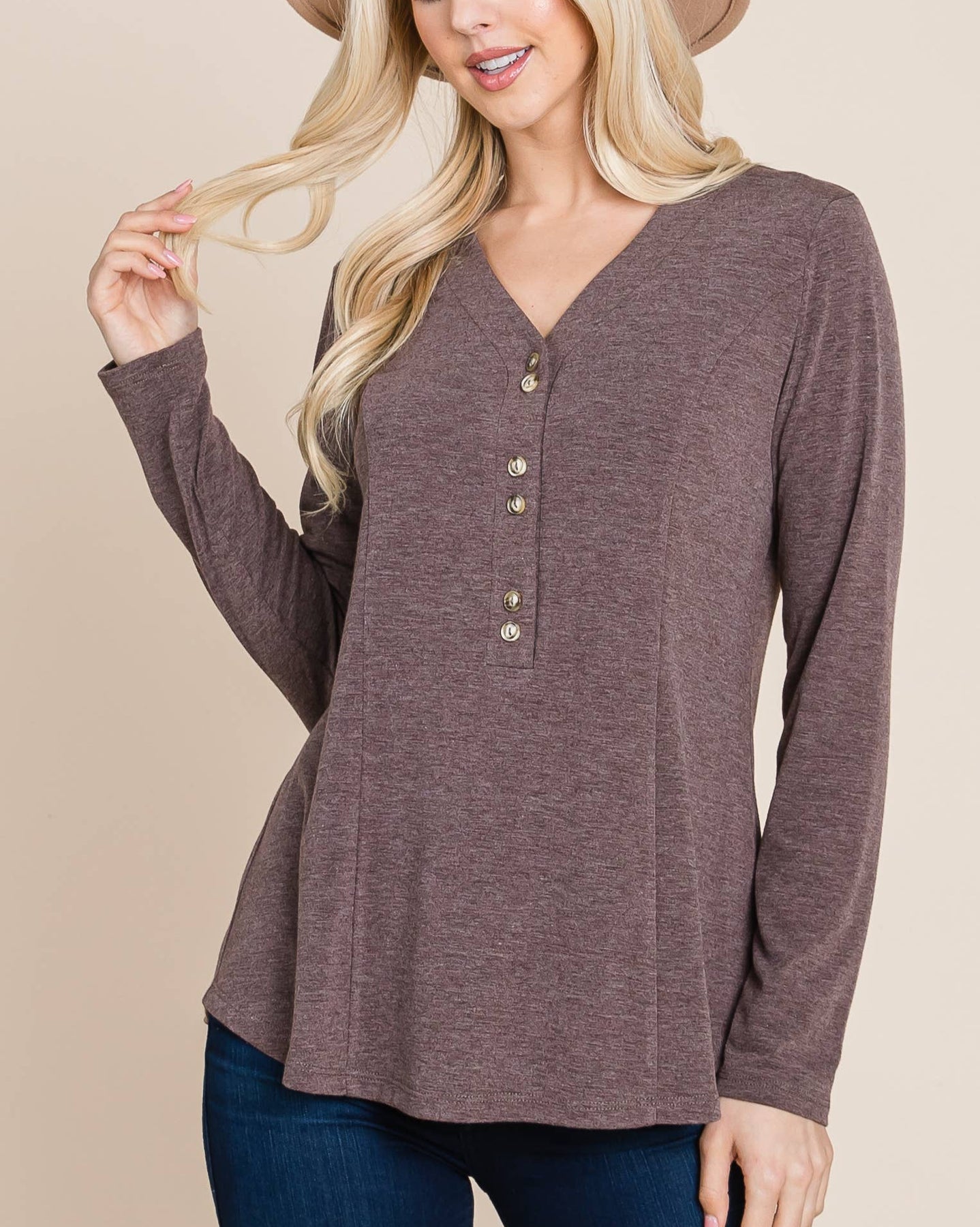 Embrace effortless style with this thoughtfully designed two-tone long sleeve top. Crafted from soft, luxurious fabric, it drapes beautifully while keeping you comfortable throughout your day. The refined v-neck and decorative button details add sophistication without sacrificing ease. Whether you're building a capsule wardrobe or refreshing your everyday basics, the complementary tone combination pairs seamlessly with everything you own. This is the reliable piece you'll reach for again and again, knowing it supports your lifestyle and your style.