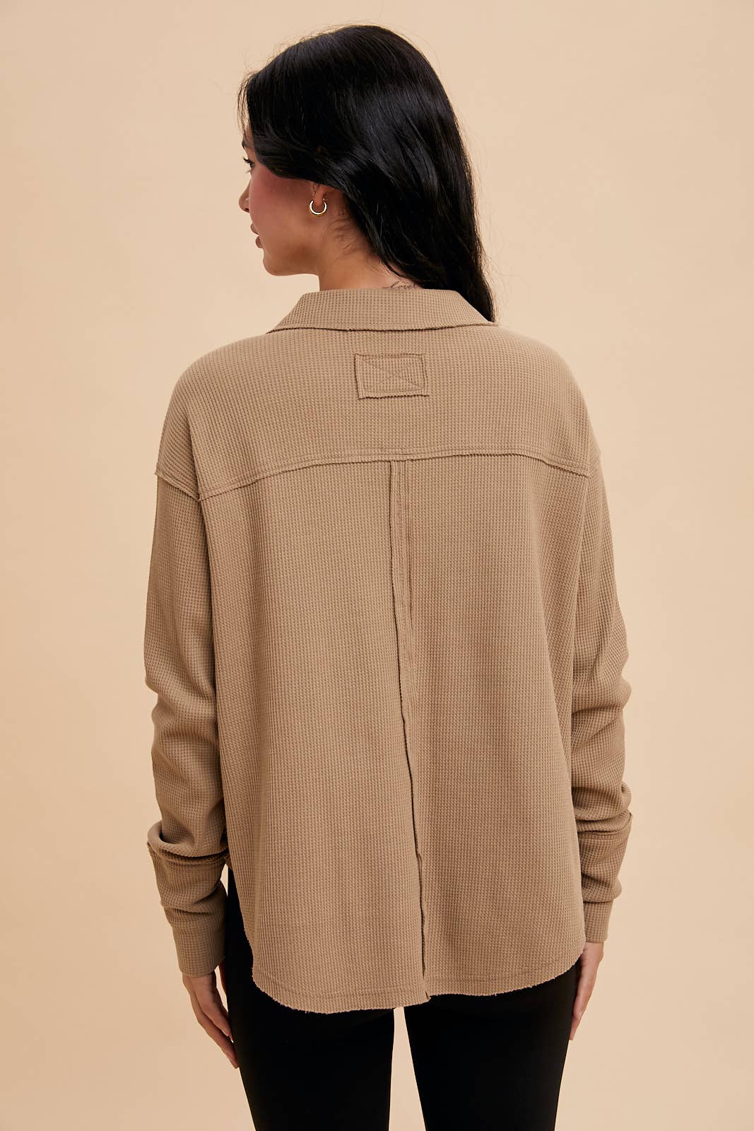 Effortlessly cool with a vintage twist, the Simone Thermal Polo is your laid-back layering MVP. Made from a soft, garment-washed thermal blend, it features a flattering split neckline, collared detail, and dropped sleeves for a relaxed look that’s still put-together.