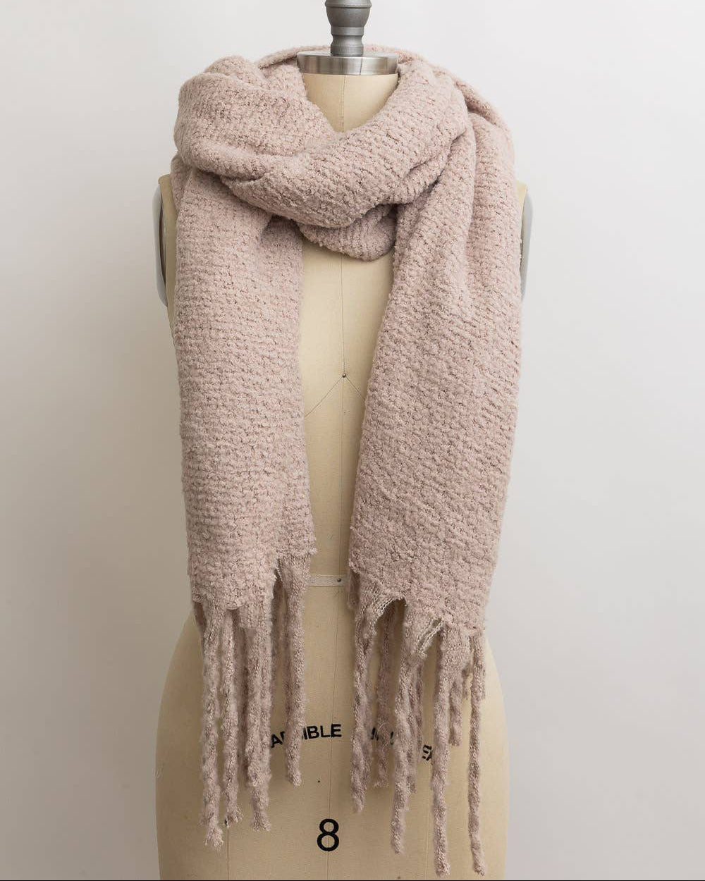 A soft blush hue meets a warm, chunky knit in this bestselling winter scarf — the perfect blend of comfort and charm. The oversized shape offers generous coverage, while tassels add a playful touch that pairs beautifully with all your cold-weather layers.