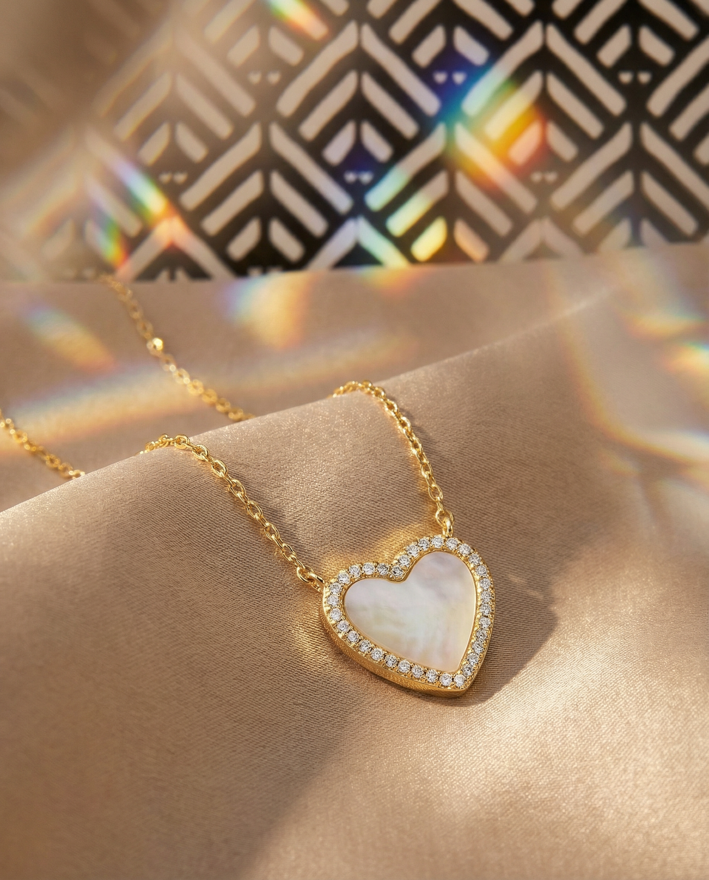Delicate, luminous, and full of sentiment, the Shell Pavé Heart Necklace is a tiny treasure designed to shine. Featuring a softly iridescent mother of pearl heart framed by shimmering pavé-set cubic zirconia, this necklace catches the light beautifully with every movement. Finished in warm gold tones, it’s perfect worn solo for a subtle statement or layered with your everyday favorites for a romantic, polished look.