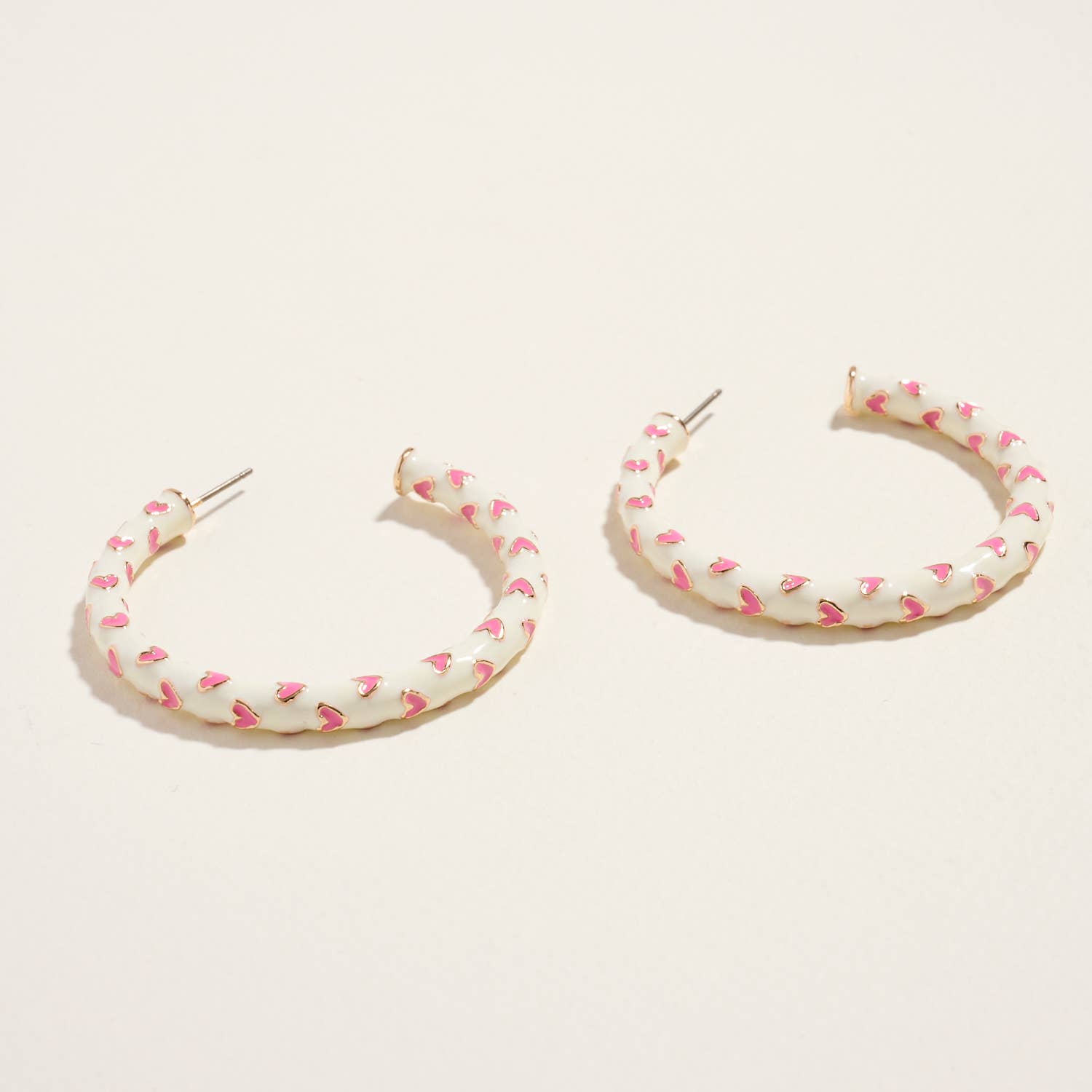 Delicate and feminine, these heart-patterned enamel hoops feature a soft ivory base accented with pink hearts for a subtle romantic look. Their polished finish and comfortable size make them a go-to choice for everyday wear with a sweet twist.