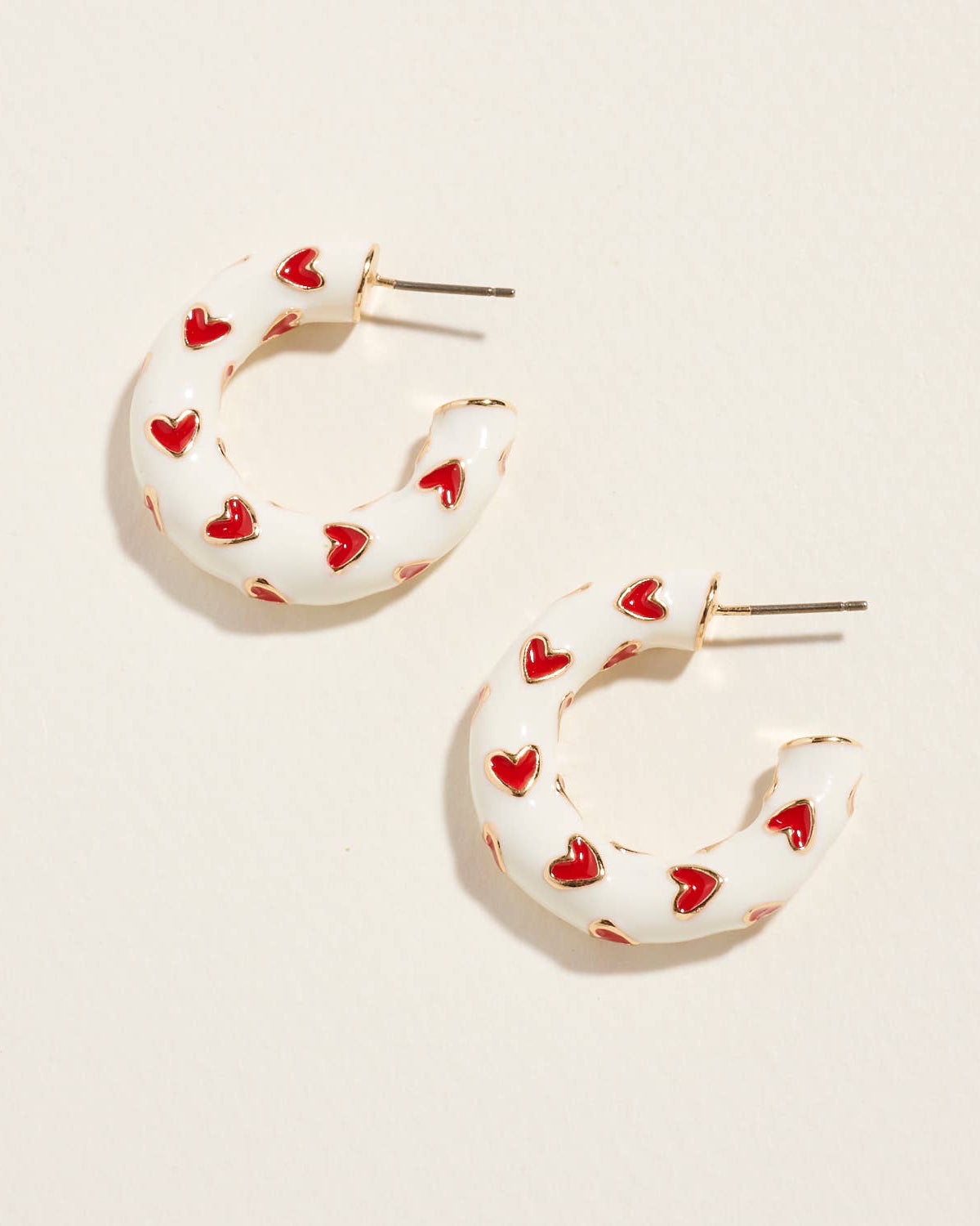 Clean and classic with a festive touch, these thick enamel hoops pair crisp white enamel with bold red hearts. The structured shape gives them a polished feel, making them perfect for elevating simple looks.