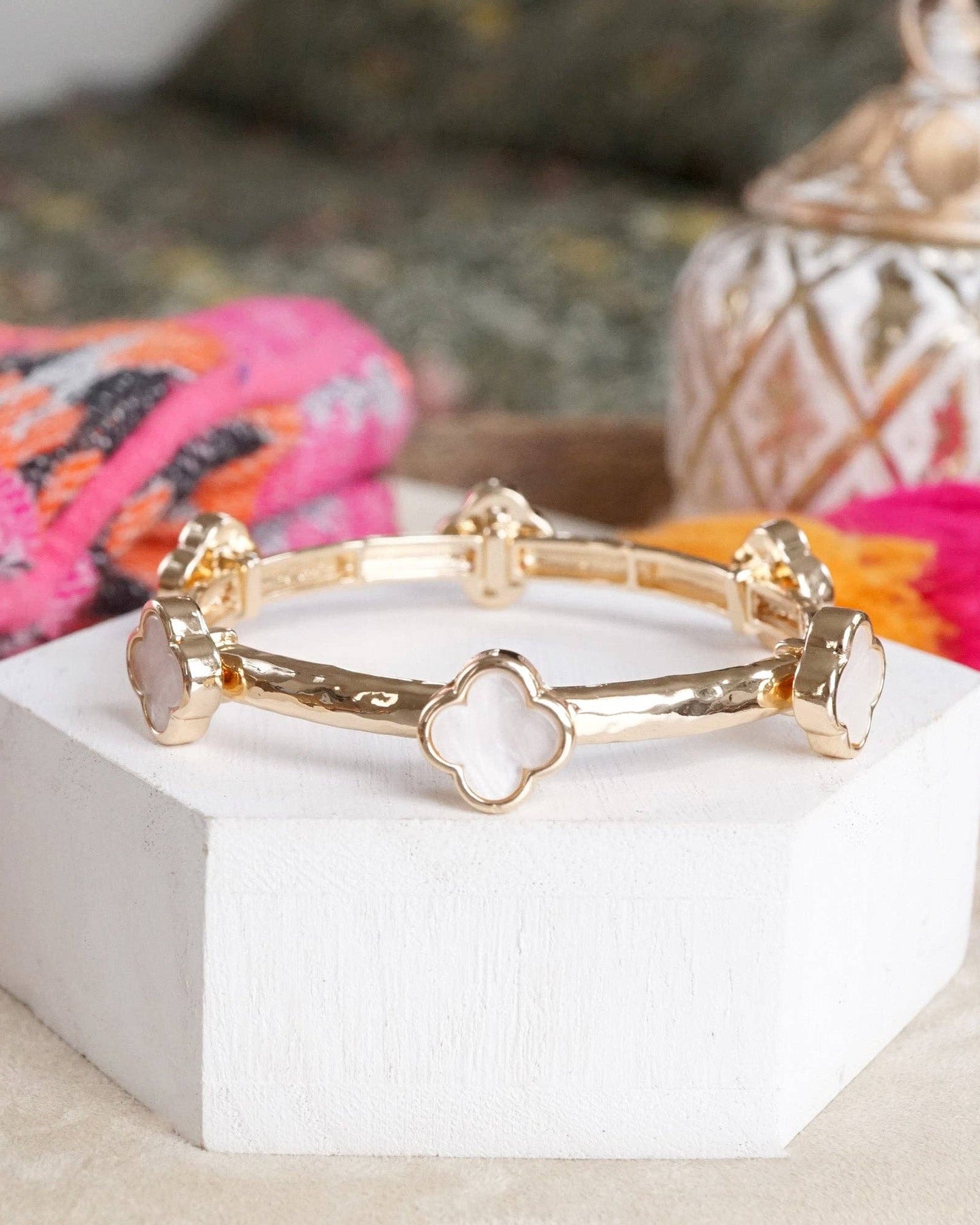 Delicate clover shapes meet easy everyday wear in this gold-tone stretch bracelet. With a softly hammered finish and classic charm, it layers beautifully or stands alone as a meaningful style staple.