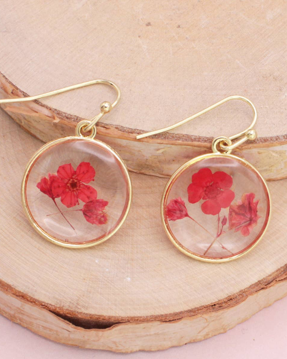 Soft, natural, and full of vintage sweetness, these round dried flower earrings celebrate the beauty of real botanicals. Genuine dark pinkish-red flowers are carefully pressed and preserved in clear resin, framed by a gold border for a delicate cottage-inspired look. No two pairs are exactly alike, making them as special as the flowers themselves.