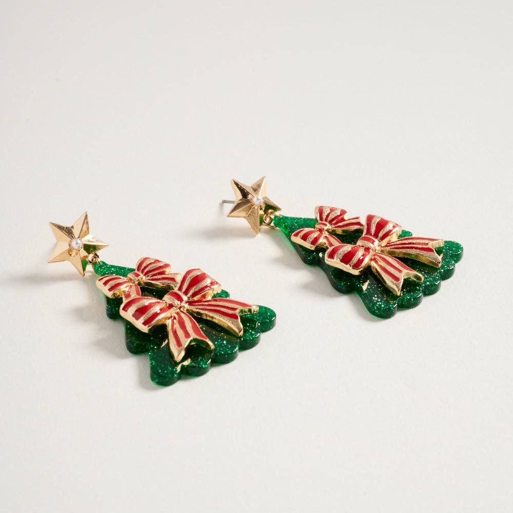 Bring on the sparkle! These glittering Christmas tree earrings are topped with bright red bows and full of festive flair from top to trunk.