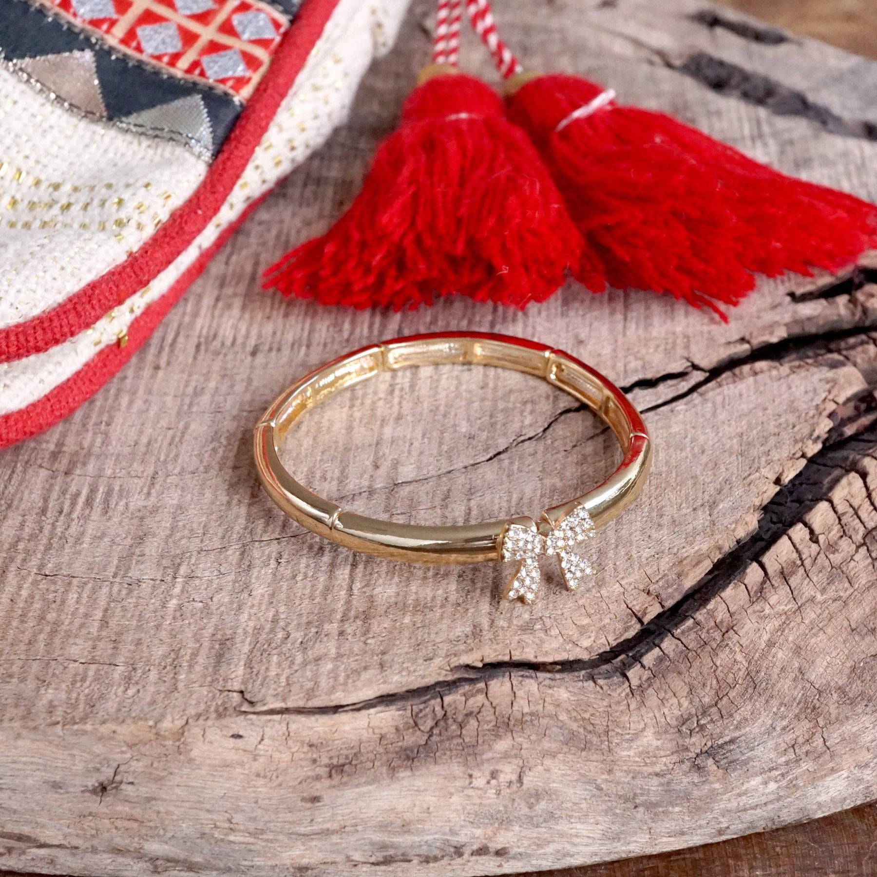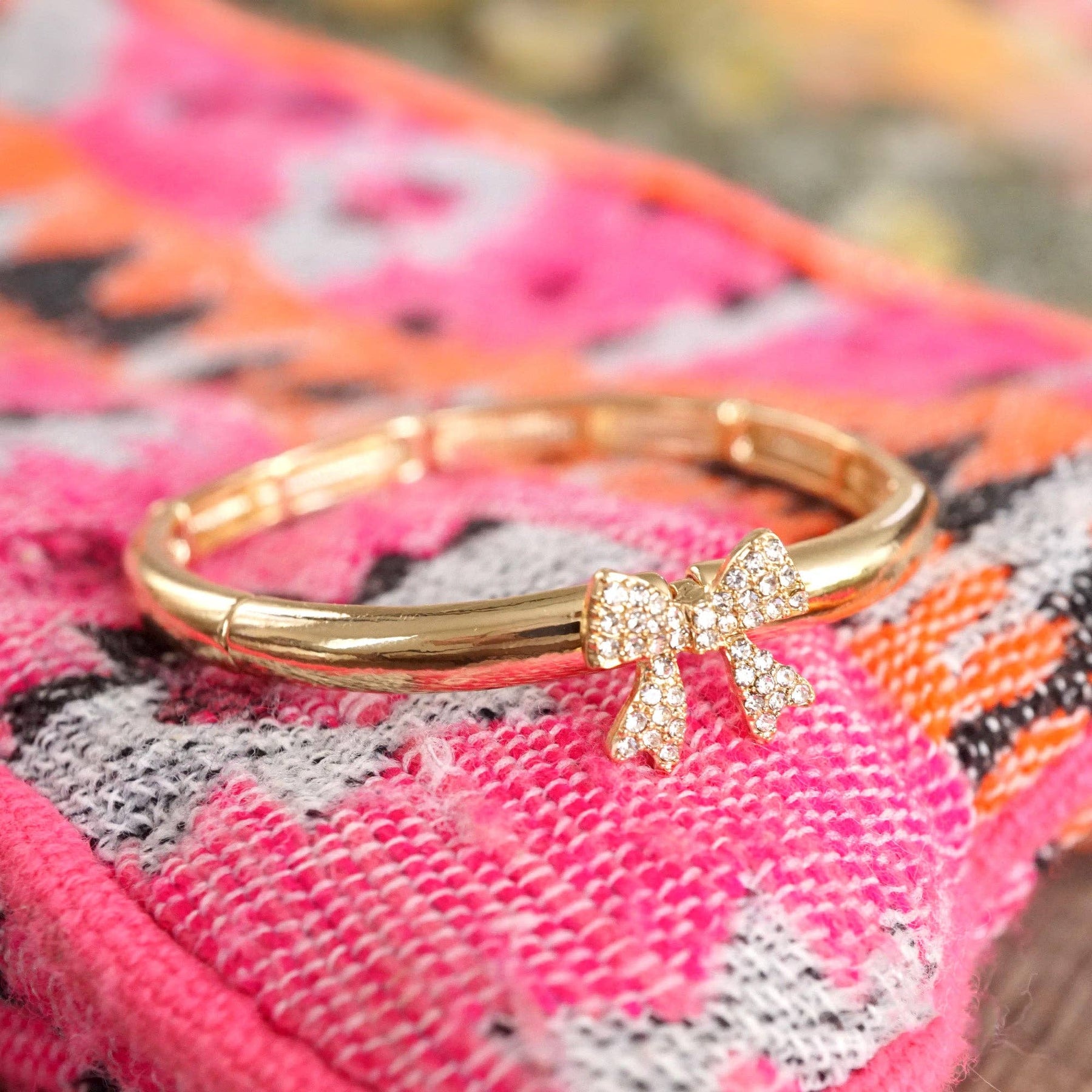 This sweet and sparkly stretchy bangle features a gold-tone finish and a clear crystal pavé bow detail. It’s the perfect dainty accent for your wrist stack or a subtle shimmer worn solo.