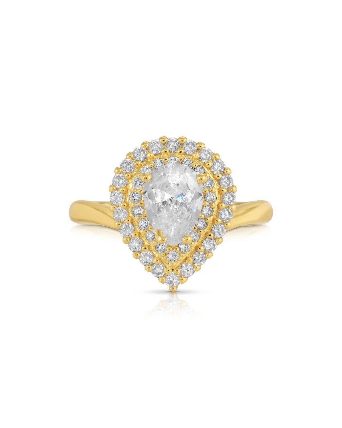 Designed to make an entrance, the Large Faux Diamond Ring brings serious sparkle with an elegant, statement-making silhouette. A teardrop-shaped cubic zirconia sits at the center, framed by a delicate pavé halo that catches the light from every angle. Finished in warm 18k gold plating, this ring delivers high-end glamour whether you’re dressing up for an evening out or adding shine to an everyday look.