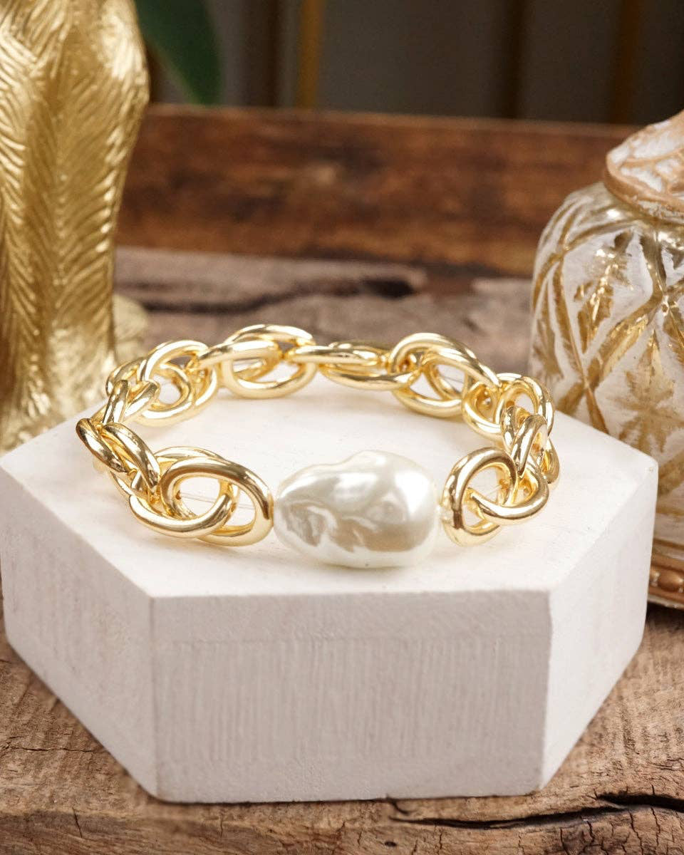 This bracelet’s dramatic links and luminous pearl detail make it a bold staple for your wrist stack or a standout solo piece.