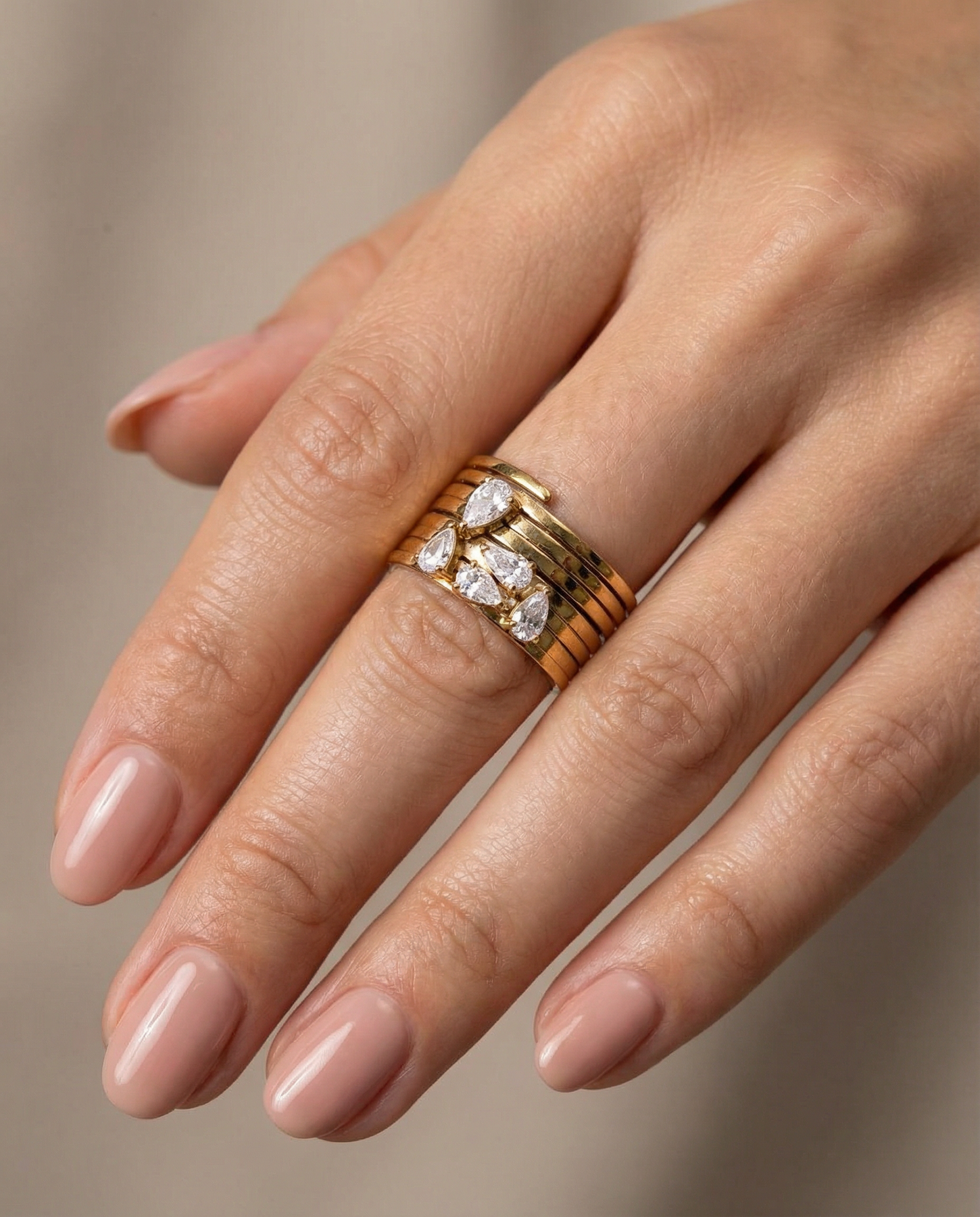 The Poppy Ring is a bold, stacked-style statement piece designed to catch the light from every angle. Featuring layered gold-tone bands accented with clear crystal details, this ring delivers texture, shine, and modern edge all in one striking silhouette.