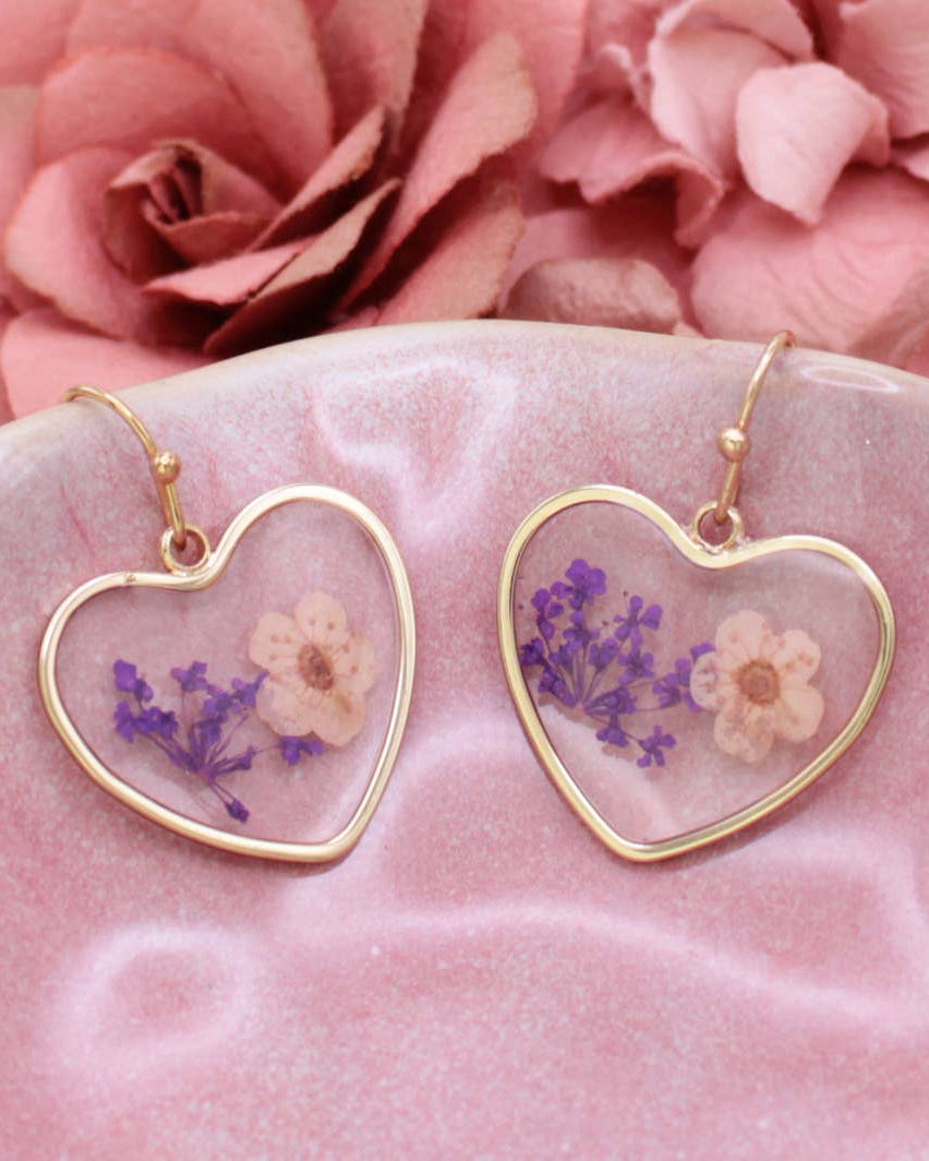 Romantic and nature-kissed, these heart-shaped dried flower earrings capture the beauty of a blooming garden. Pink and purple dried flowers are encased in clear resin and framed in gold, creating a sweet, vintage-inspired design that feels both sentimental and stylish.