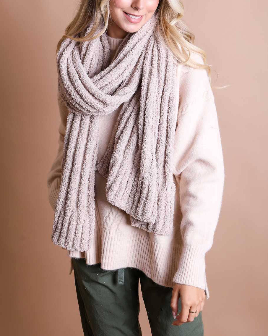 Soft, neutral, and beautifully textured, this boucle knit scarf delivers lightweight warmth with a luxe feel. The vertical-knit design drapes gracefully, making it an easy match for everything from casual layers to dressier winter coats.