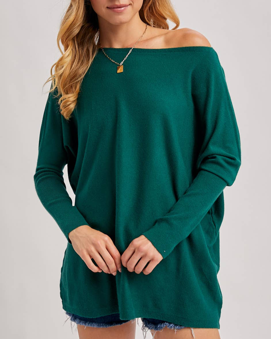 This easy, flowy tunic brings that relaxed-but-polished vibe we all love. The boatneck drapes softly across the shoulders, while the dolman sleeves create that effortlessly flattering shape—stylish without ever trying too hard. The hunter green knit is lightweight, breathable, and perfect for layering from fall into spring.