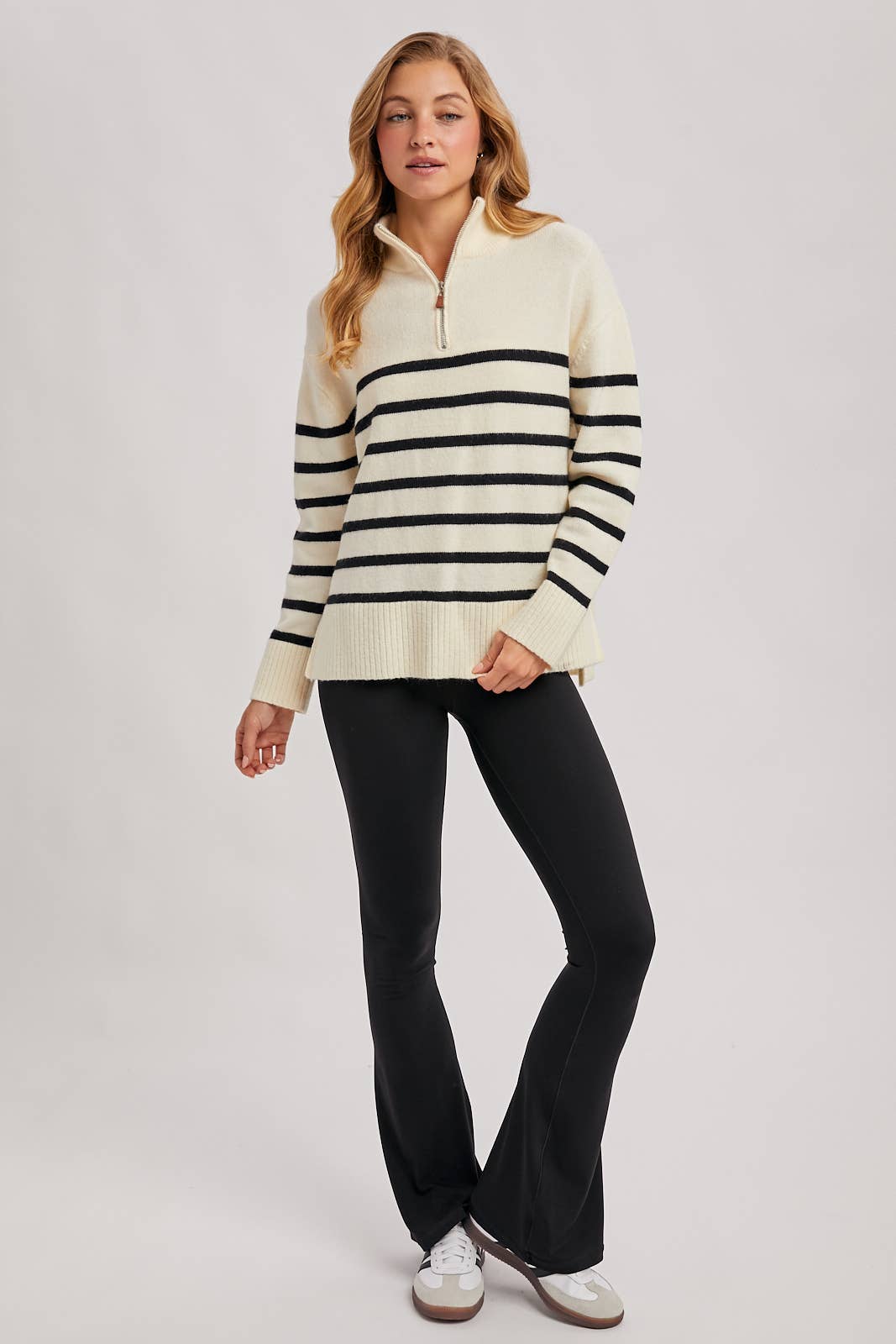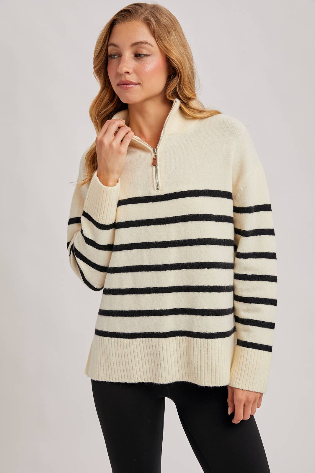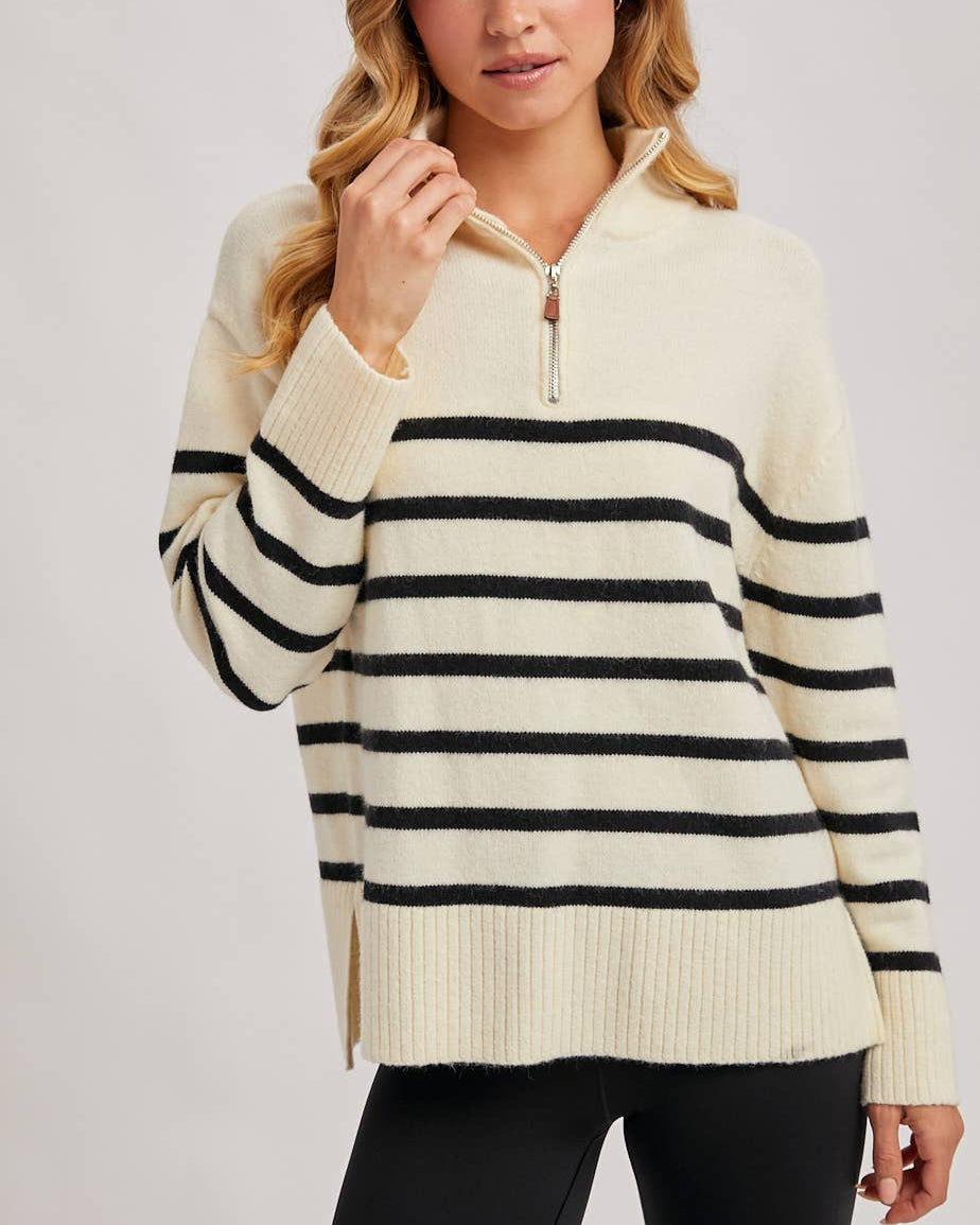 Classic stripes meet everyday comfort in this ivory quarter-zip pullover. The ribbed mock neck adds warmth and structure, while the relaxed fit makes it an easy go-to for casual days or polished layering. With ribbed cuffs and hem for a clean finish, it’s the kind of piece you can zip up for a cozy look or open slightly for a laid-back weekend feel.