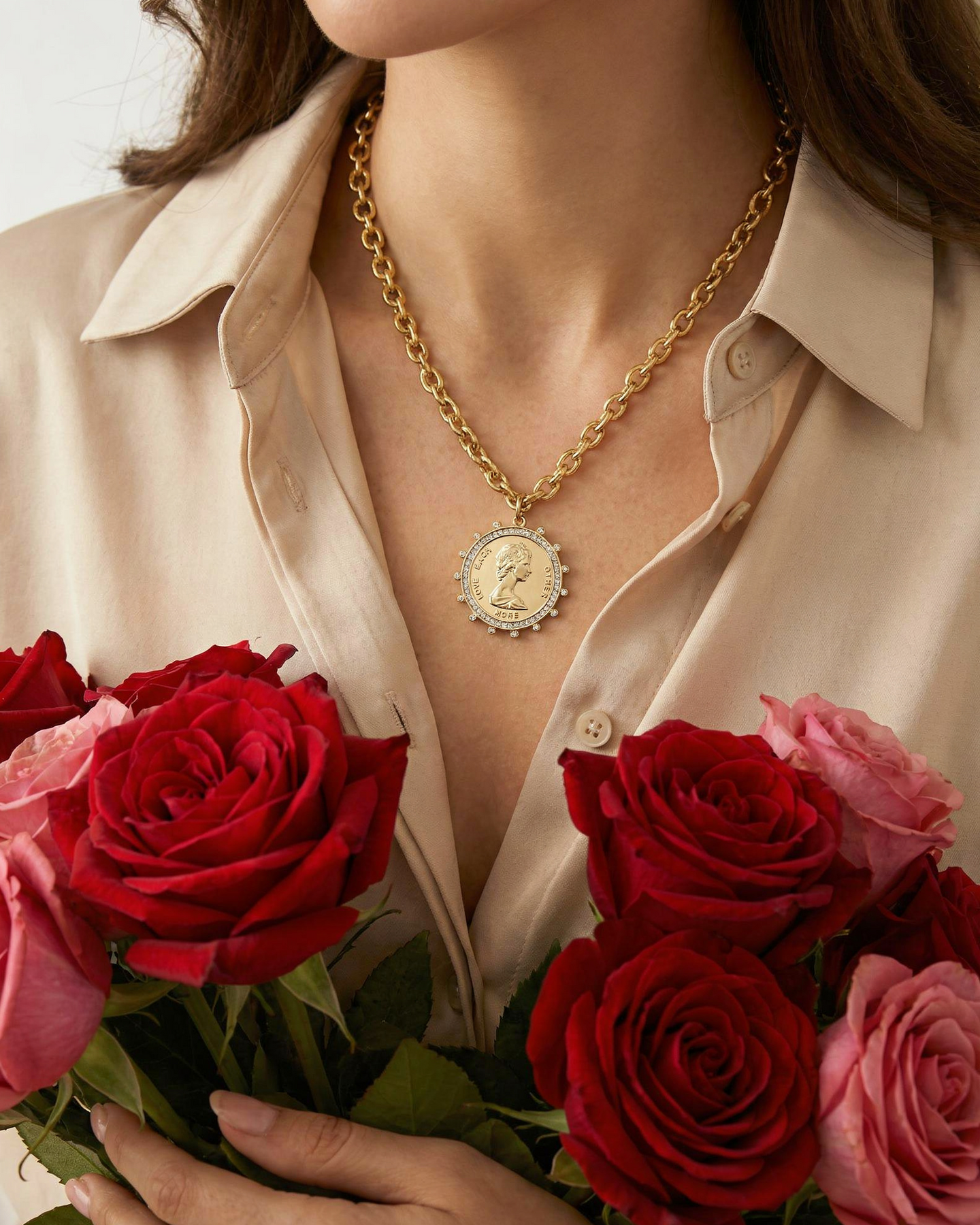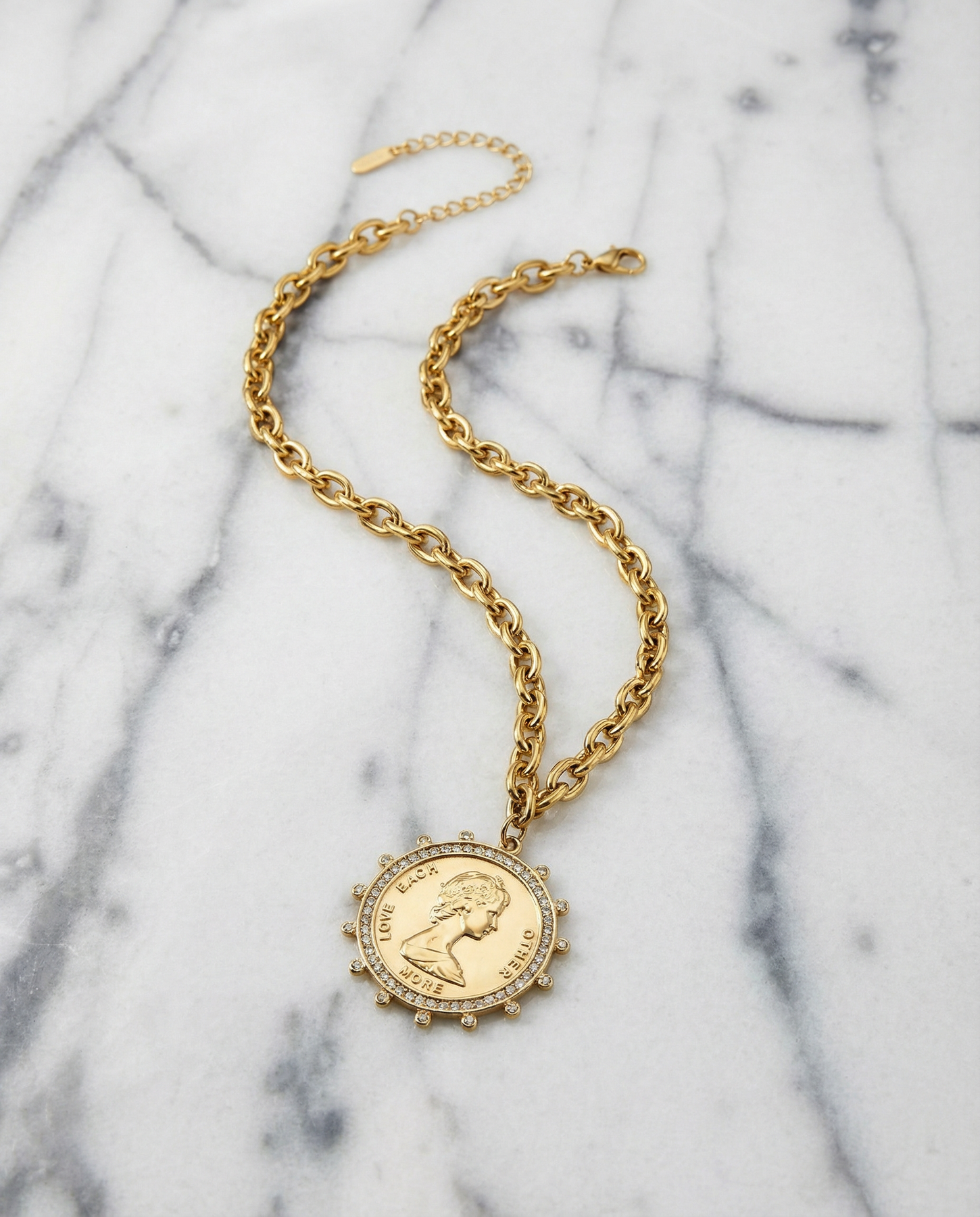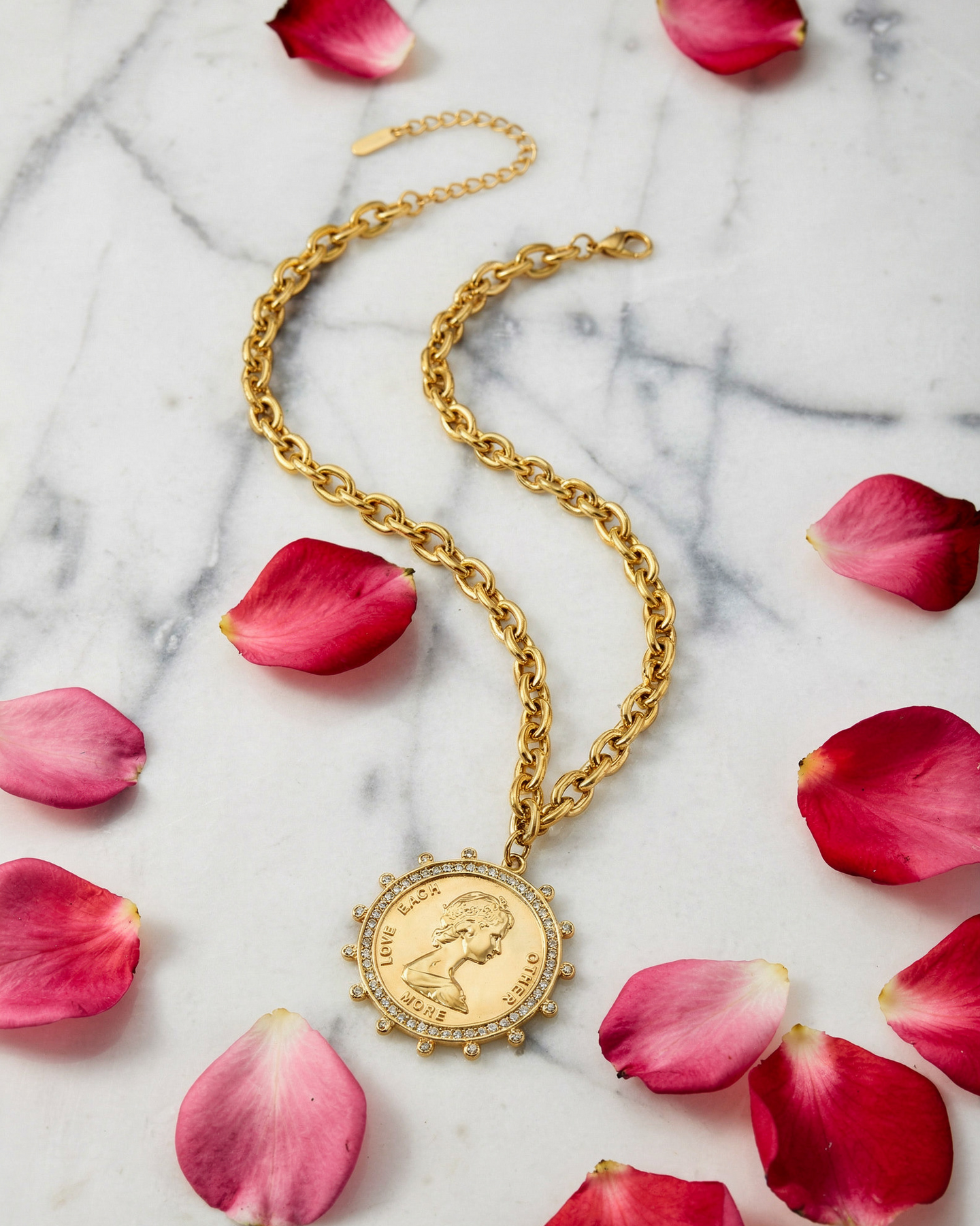 Delicate with just enough presence, the Small Coin Necklace is a timeless piece infused with meaning. Featuring a classic coin pendant engraved with the words “LOVE EACH OTHER MORE,” this necklace blends soft sparkle, vintage-inspired charm, and everyday wearability. The subtle crystal detailing around the coin adds a gentle glow without overpowering the design.
