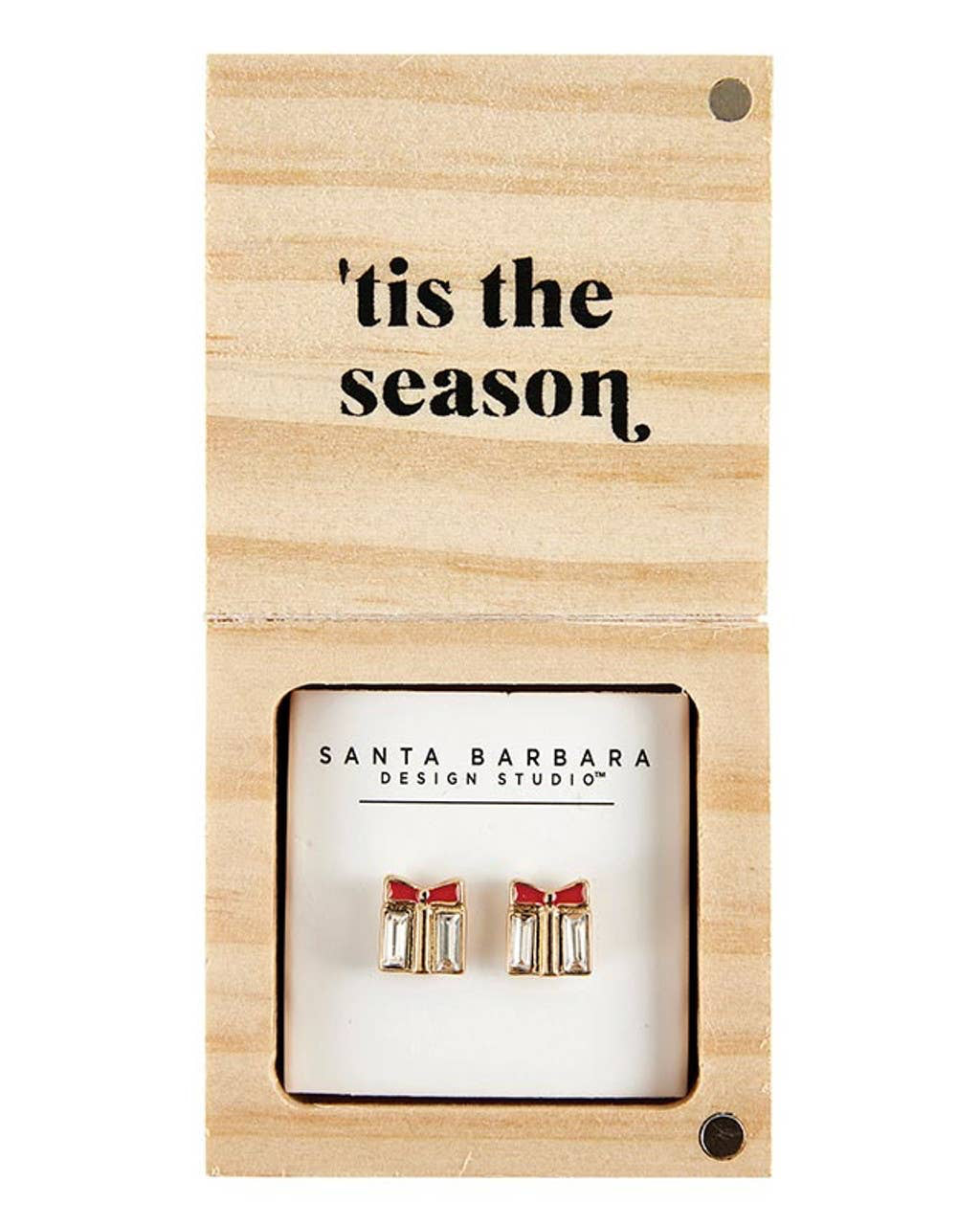 A tiny box full of sparkle! These gift-shaped earrings come nestled inside a pinewood box with whimsical holiday artwork and a sweet sentiment inside the lid. A thoughtful treasure for the season.