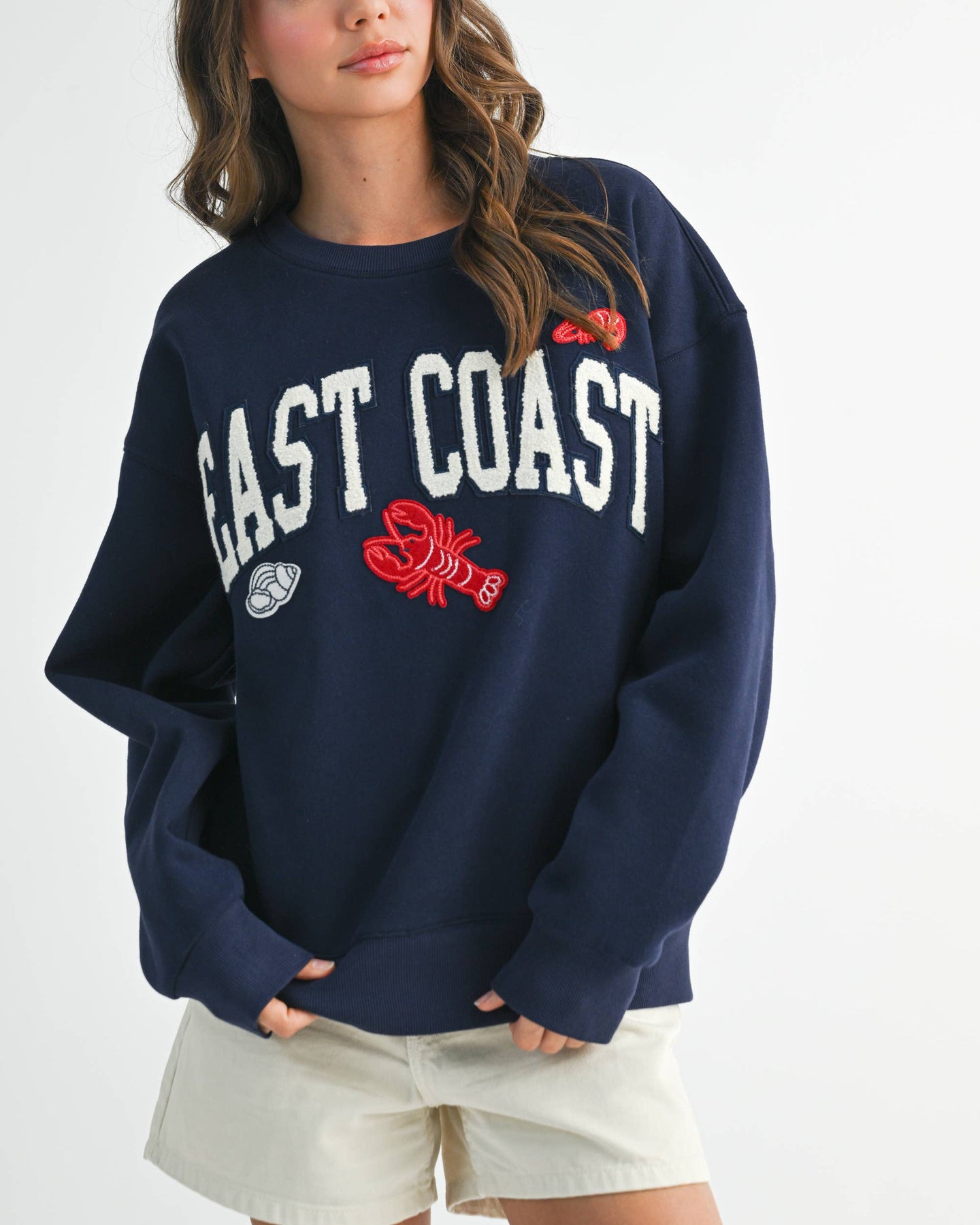 Cozy with a dose of seaside nostalgia, the Celina East Coast Lobster Pullover is an easy favorite for laid-back coastal style. Designed with bold collegiate “East Coast” lettering and playful lobster and shell motifs, this navy sweatshirt brings charm and personality to an everyday essential. The plush fleece feel and relaxed fit make it perfect for crisp mornings, cool evenings, and effortless throw-on-and-go outfits.