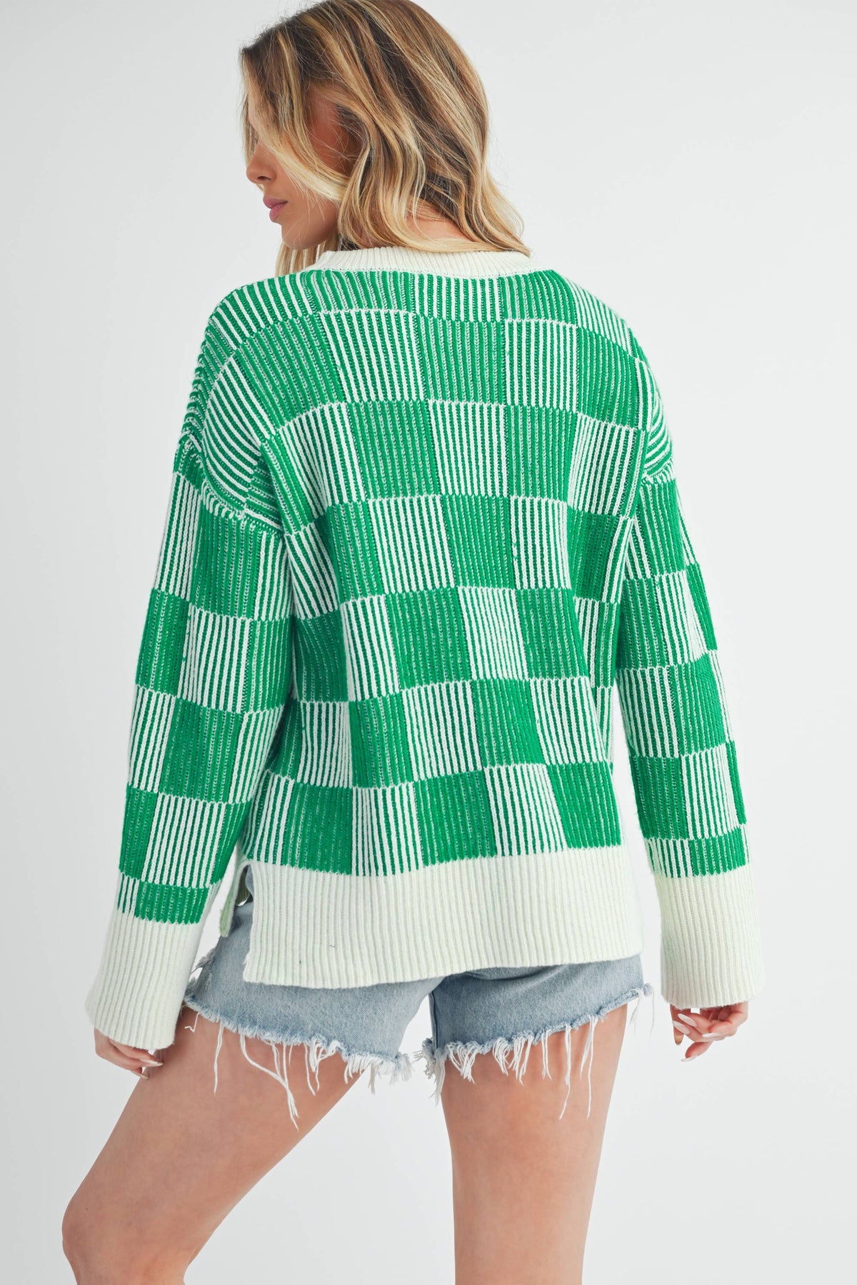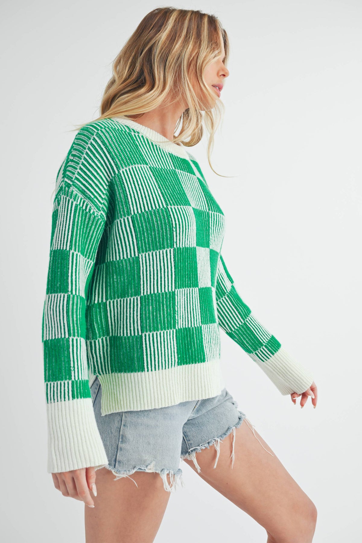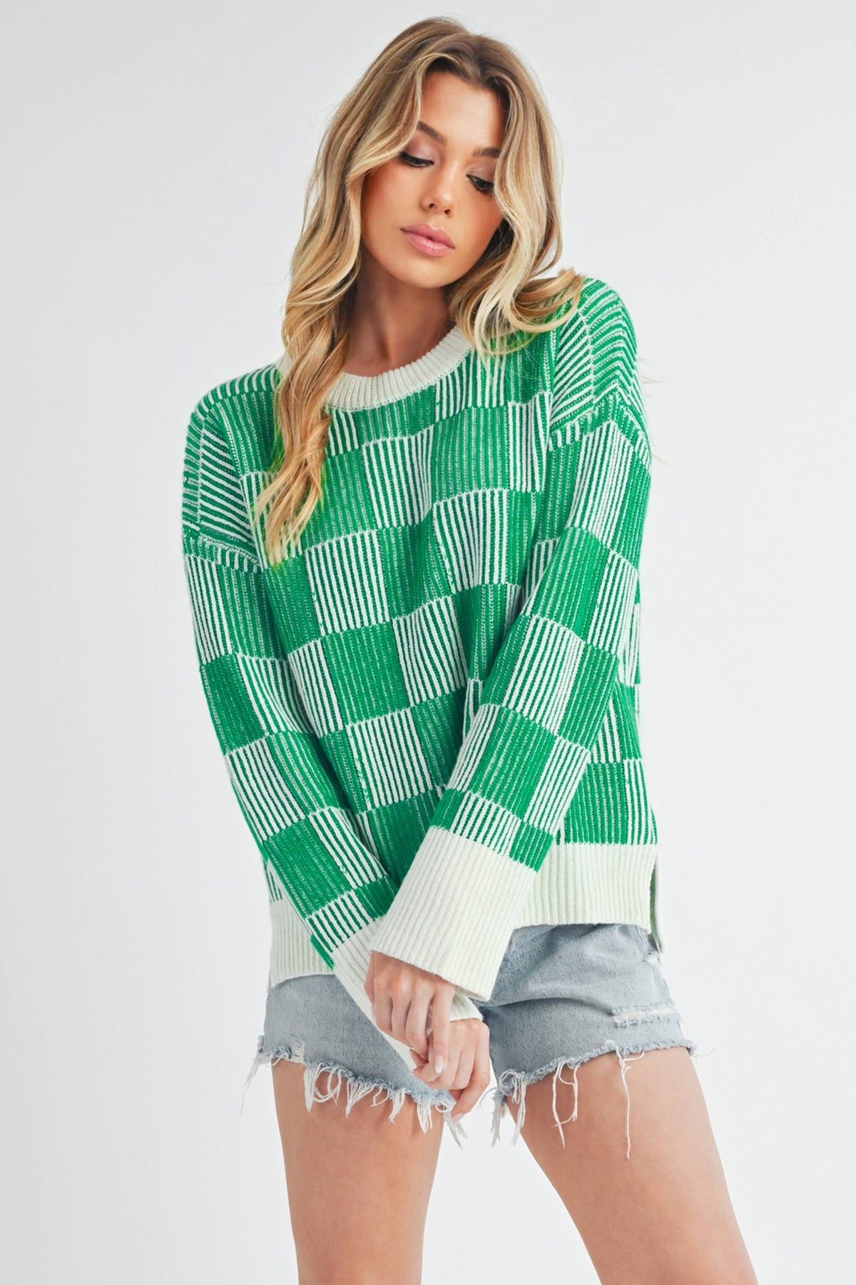 Sporty meets chic in the Zora Catalina Sweater, a bold yet wearable statement piece designed for effortless styling. This two-toned green checkerboard sweater features an oversized body and wide sleeves, giving it a relaxed, modern silhouette that feels both comfortable and intentional. Crafted in a soft yarn blend, it layers easily over tees or tanks and pairs just as well with denim as it does with tailored pants.