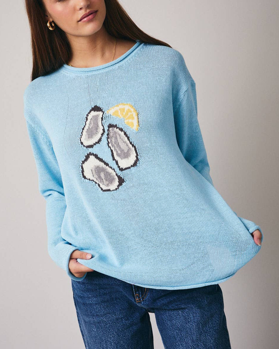 Fresh, coastal, and effortlessly relaxed, the Oyster & Lemon Lightweight Sweater brings a playful twist to an easy, everyday layer. Designed in the same breathable knit and relaxed silhouette you love, this long sleeve sweater features a charming oyster and lemon graphic that feels both seaside-inspired and subtly whimsical. Perfect for cool mornings, breezy afternoons, or layering over a tank or swimsuit, it’s an easy go-to for laid-back coastal style.