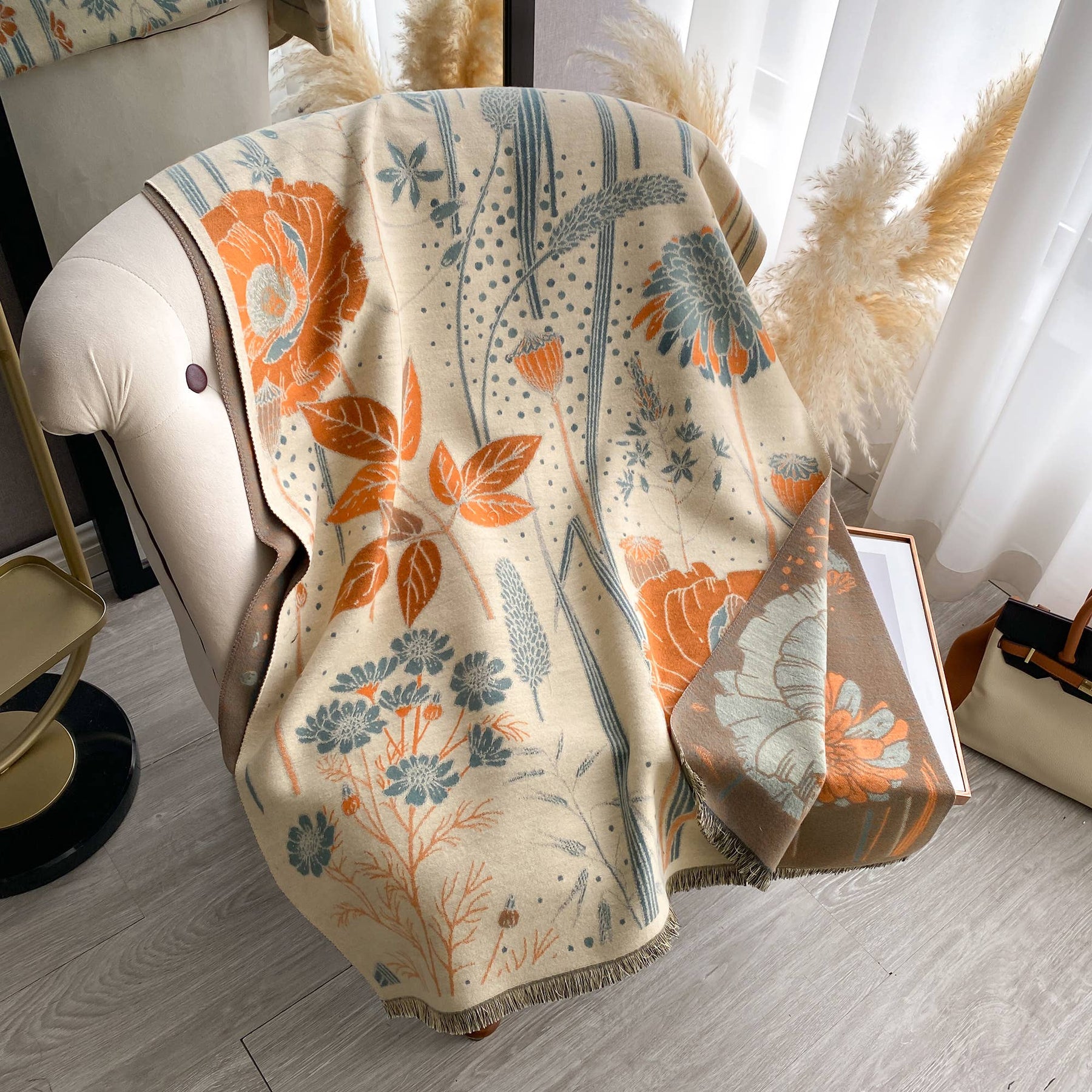 Soft, striking, and endlessly versatile, the Wild Wheat Reversible Wrap adds effortless polish to any look. Designed with a bold orange and blue palette and a graceful wheat motif, this wrap drapes beautifully whether worn casually over denim or styled as a chic finishing layer for dressier moments. The cashmere-like feel makes it a cozy favorite you’ll reach for again and again.