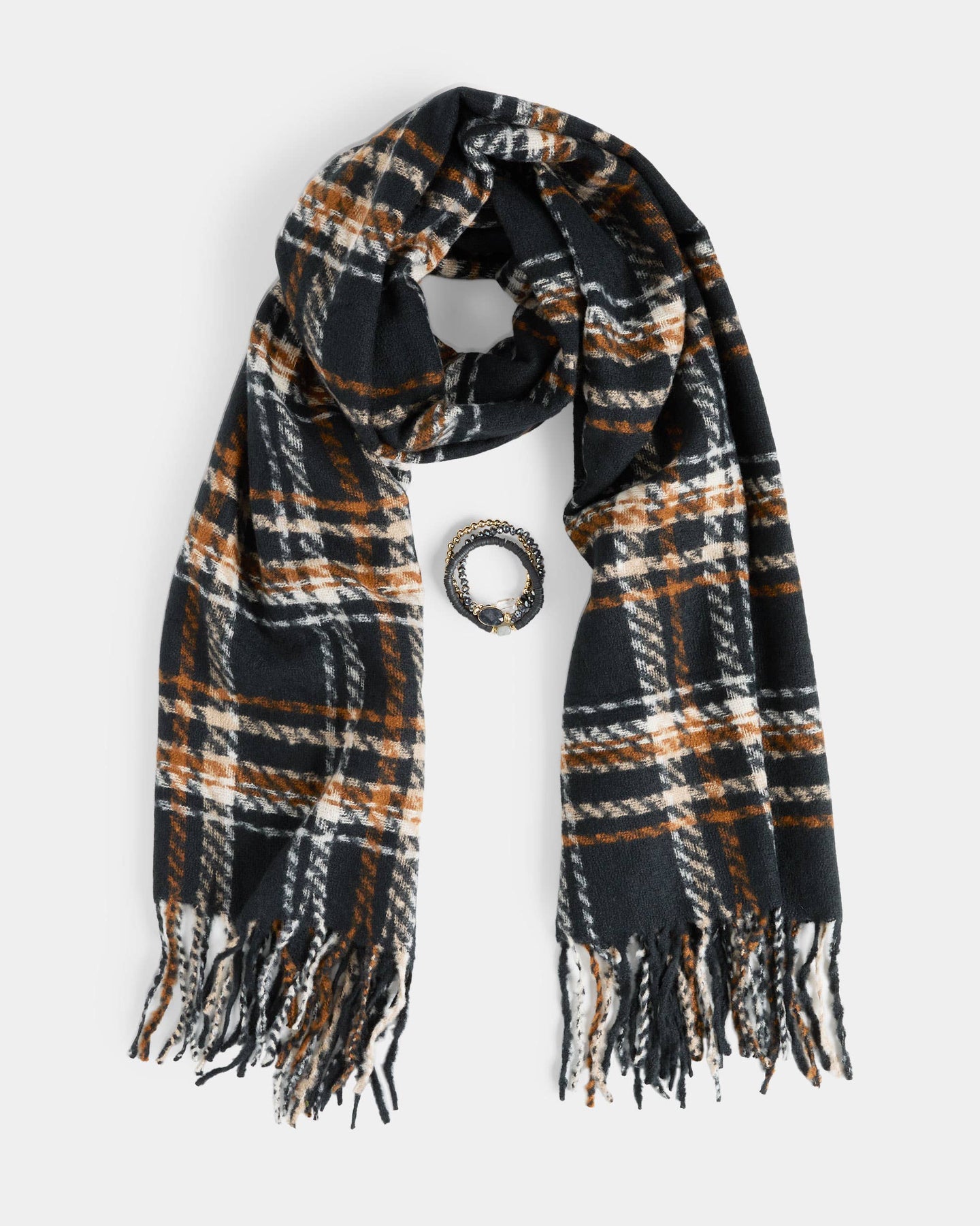 Bold and classic, this black plaid scarf brings the drama with warm caramel, white, and espresso stripes—perfect for chilly days and elevated layers. Paired with a navy-accented bracelet for a dash of sparkle, this set is made for gifting in style.
