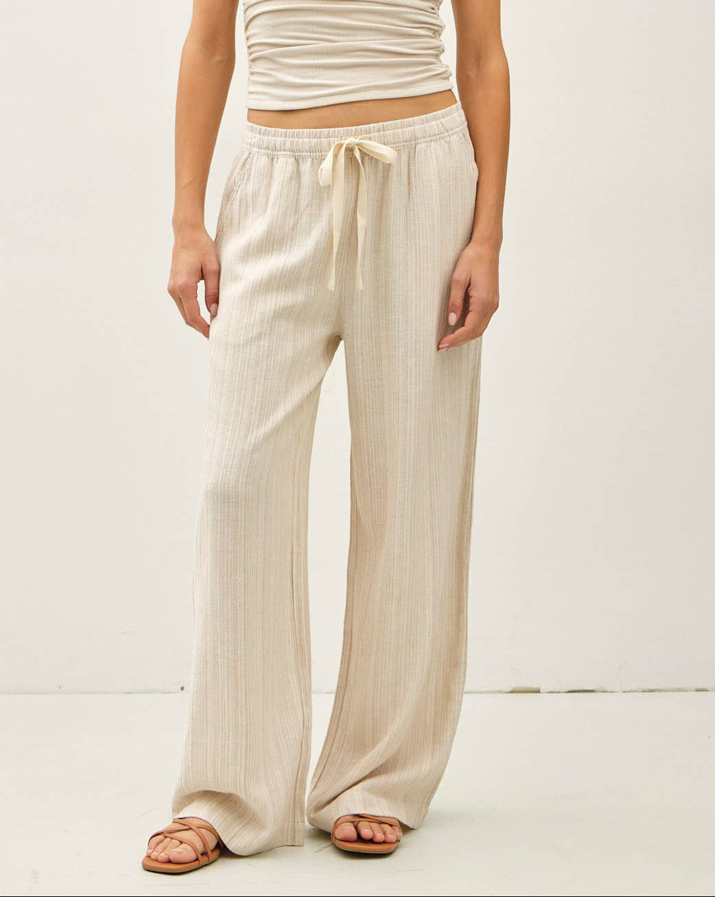 Lightweight, breathable, and effortlessly relaxed, these striped linen wide leg pants are made for easy, everyday wear. The natural-toned stripe keeps the look soft and versatile, while the wide leg silhouette adds a laid-back, breezy feel. Designed with comfort in mind, the pull-on style and adjustable drawstring waist make them an easy choice for warm days, travel, or casual outings.
