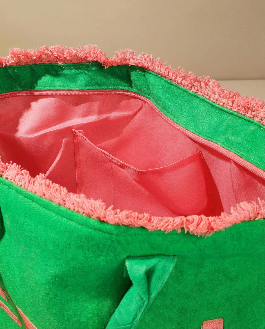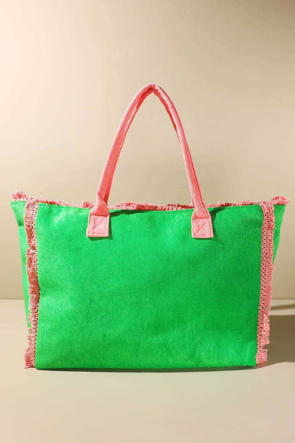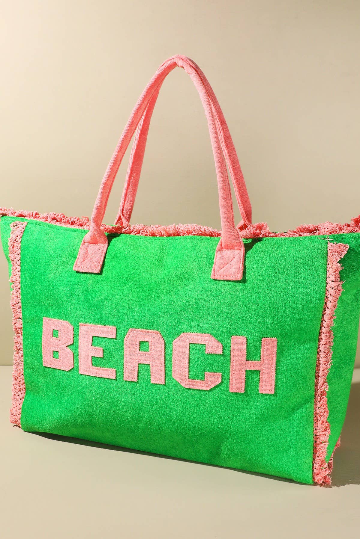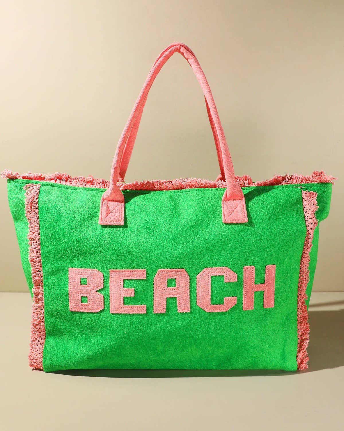 Terry Cloth Frayed 'BEACH' Bag - Green
