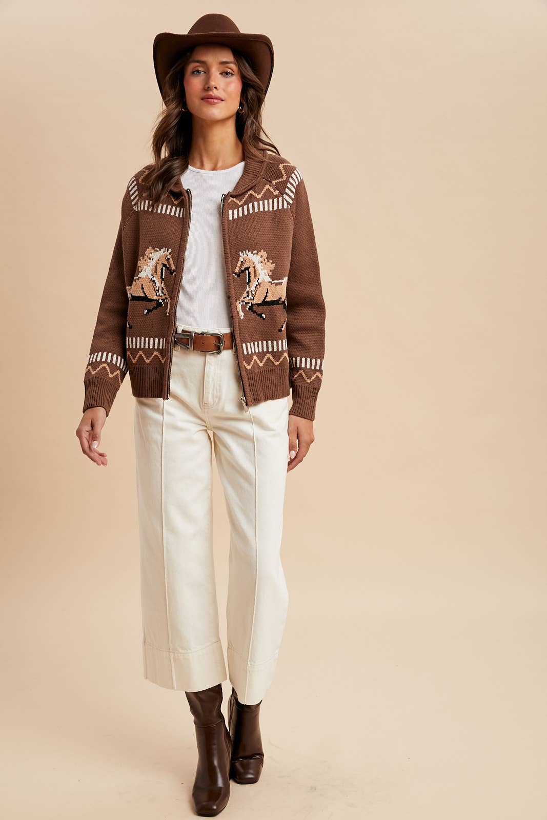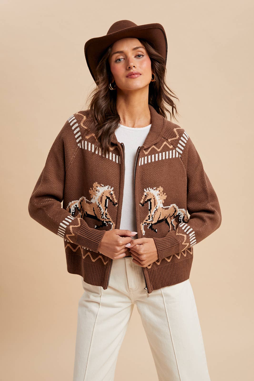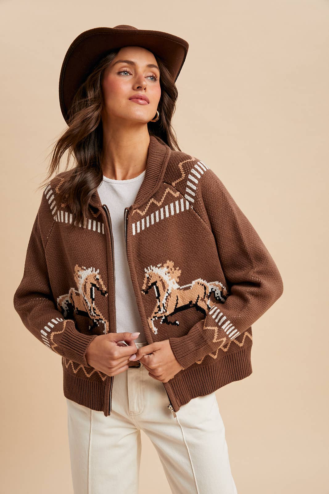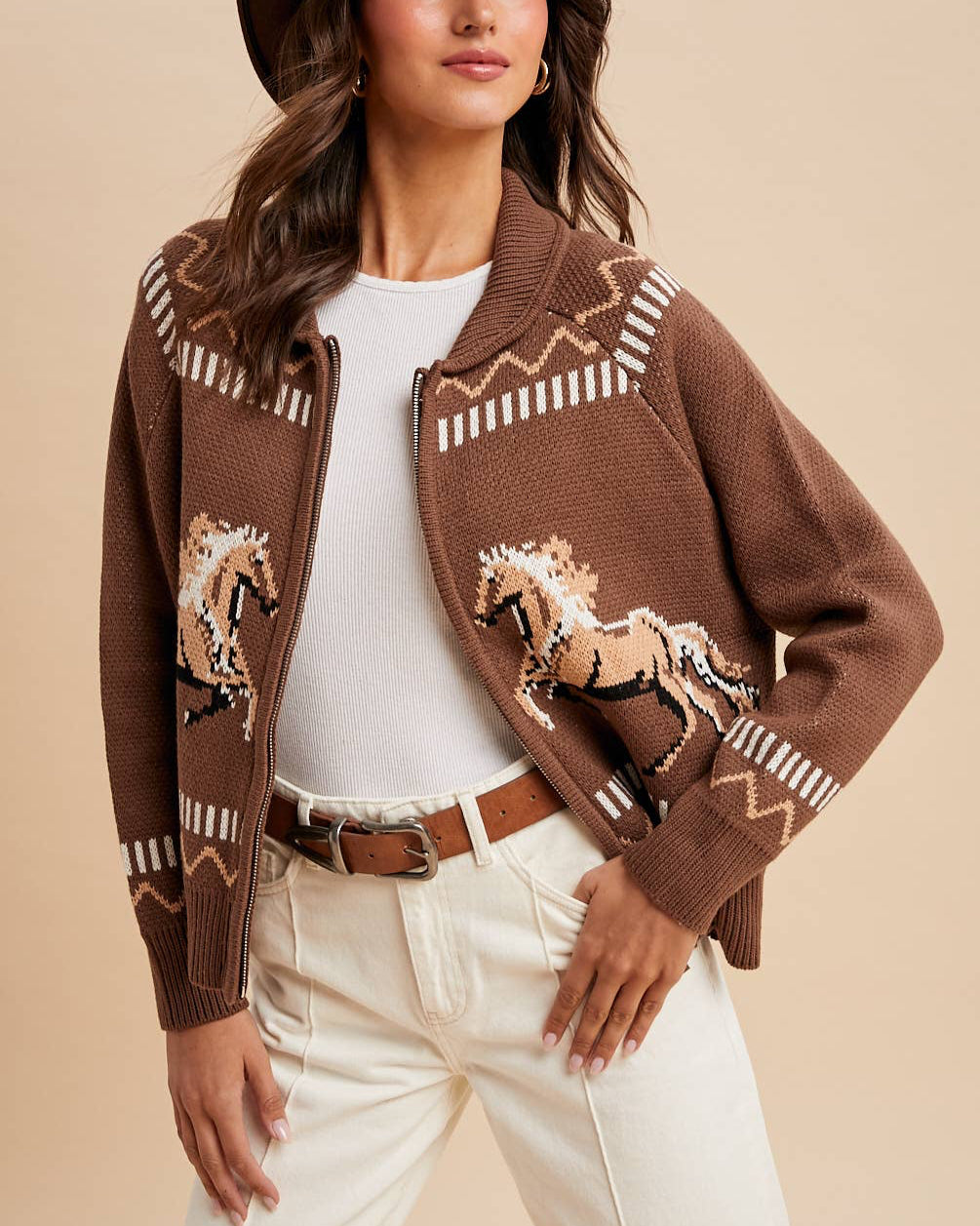 Add a little wild west charm to your wardrobe with the Mae Cardigan. This playful piece features a cozy knitted cotton jacquard with an allover horse motif, finished with a retro metal zipper and soft ribbed trim. It’s the perfect blend of fun and functional for chilly days.