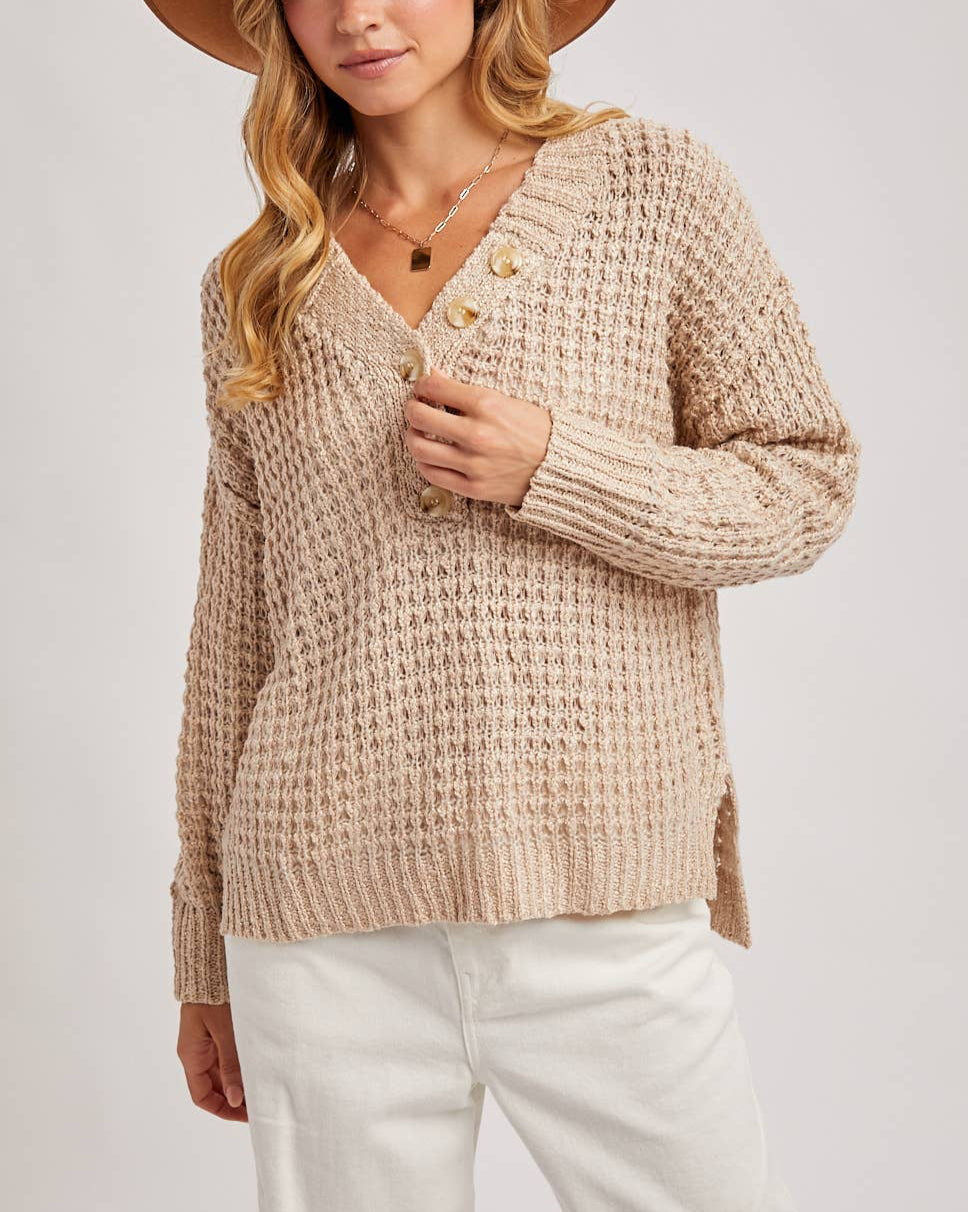 Cozy meets casually refined in this textured thermal knit sweater with a modern twist. Designed with a flattering henley neckline, oversized buttons, and side slits for movement, this top adds subtle drama to your everyday layers. Dropped shoulders and a relaxed fit create an effortlessly chic silhouette that works from coffee runs to casual nights out.
