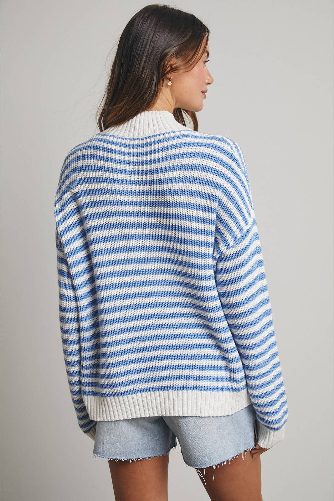 The Sophia Striped Half-Zip Sweater in blue delivers the same sporty-chic comfort with a fresh, classic color palette. Soft fabric, a relaxed silhouette, and an adjustable zip neckline make this an easy go-to for casual days, travel, or light layering.