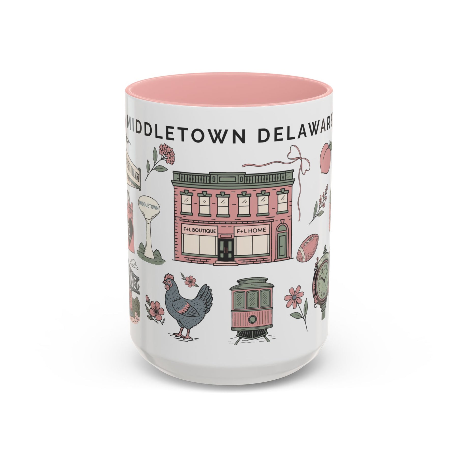 Celebrate your favorite hometown haunts with our charming Middletown, Delaware ceramic mug, featuring original illustrations inspired by local icons. From the historic Everett Theatre and iconic water tower to the Summit Bridge, vintage trolley, F+L Boutique, and F+L Home storefronts... each detail was lovingly created to honor the heart and charm of our town. Blush-toned flowers, a coquette-style bow, and other whimsical accents wrap the design in playful nostalgia, making this the perfect keepsake or gift for anyone who holds Middletown close.