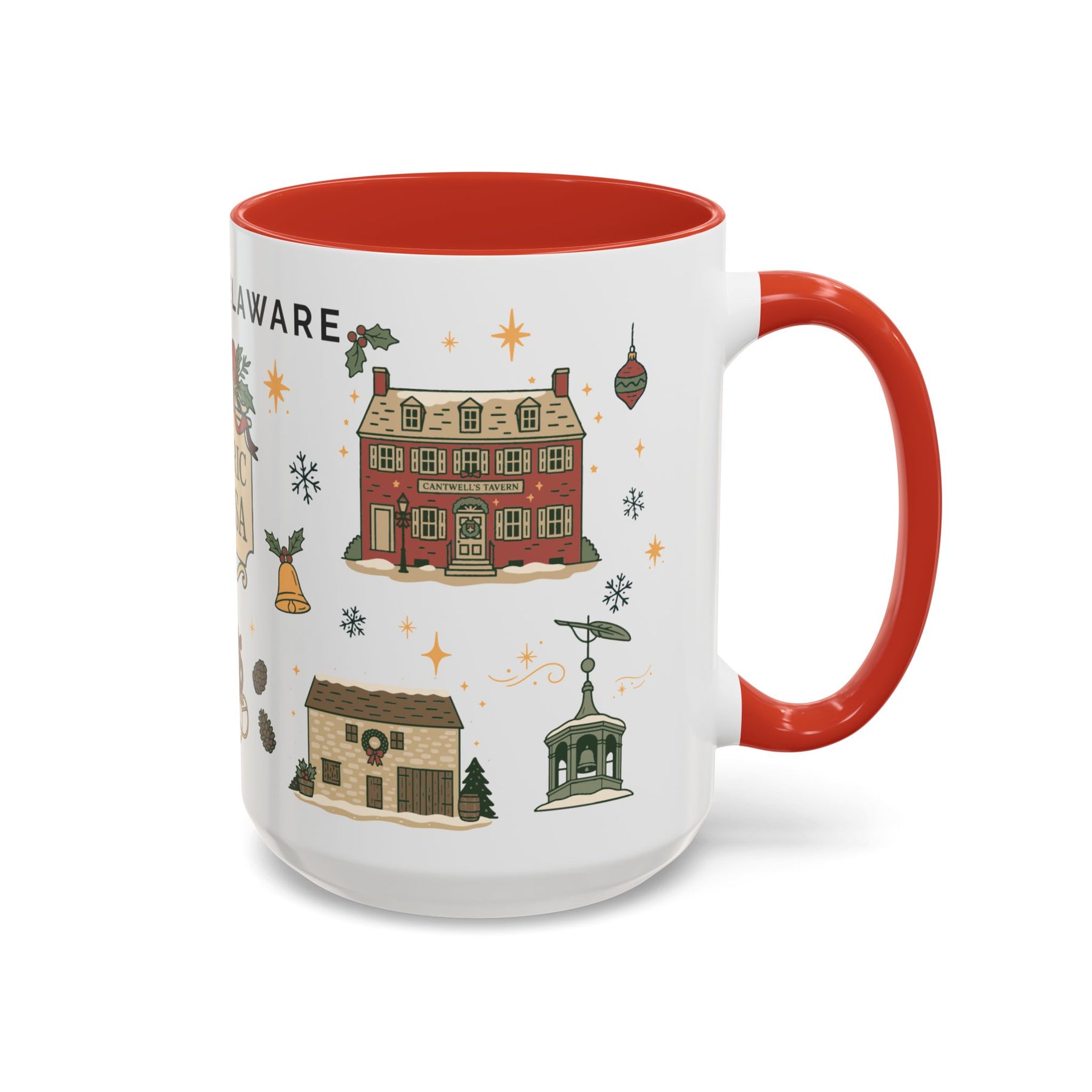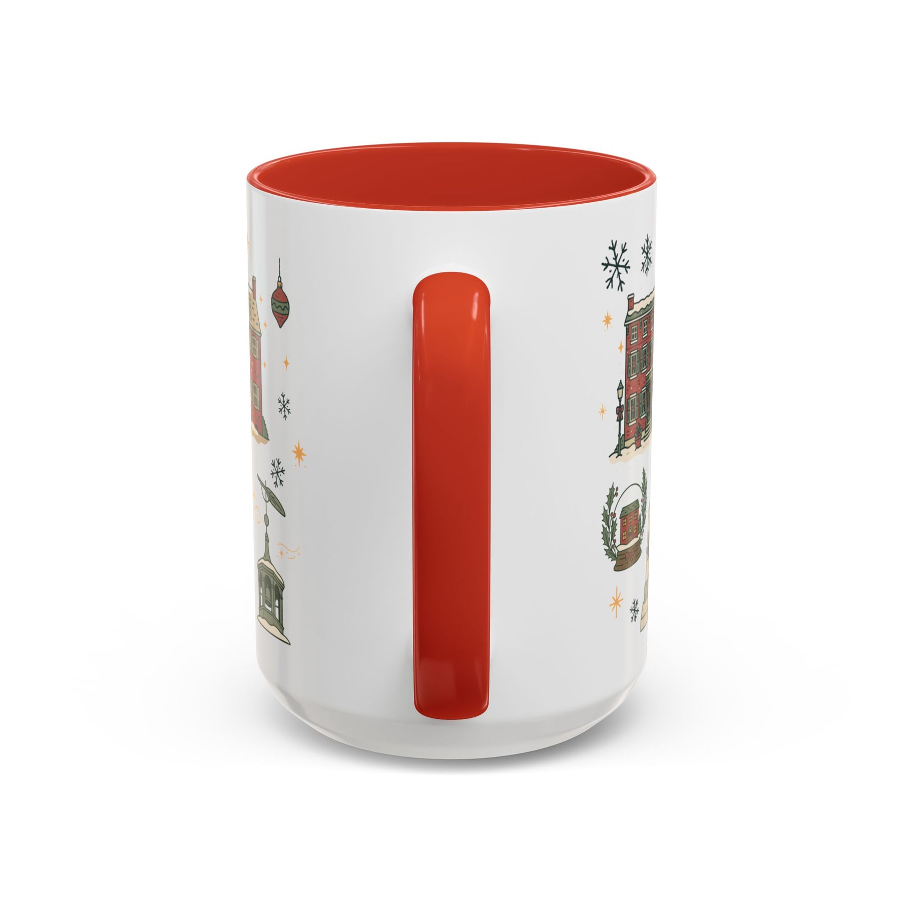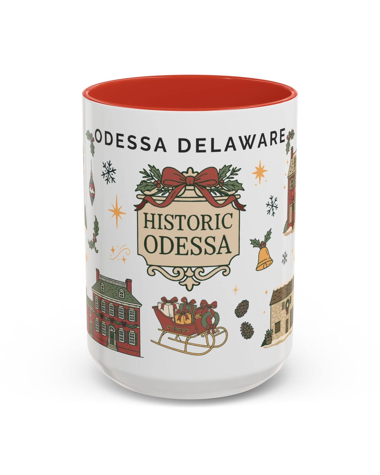 Celebrate the magic of Historic Odessa with this festive ceramic mug, wrapped in original holiday illustrations inspired by the beloved stops along the Historic Odessa Foundation. From the iconic brick façades of Cantwell’s Tavern and the Old Bank to the timeless charm of Wilson-Warner, Wilson Barn, and Corbit-Sharp Houses, each building is lovingly sketched in a cozy, vintage-Christmas style. American holly (the Delaware state tree) winds through the design with berries, bows, and seasonal accents, creating a nostalgic winter scene that feels straight out of a storybook.