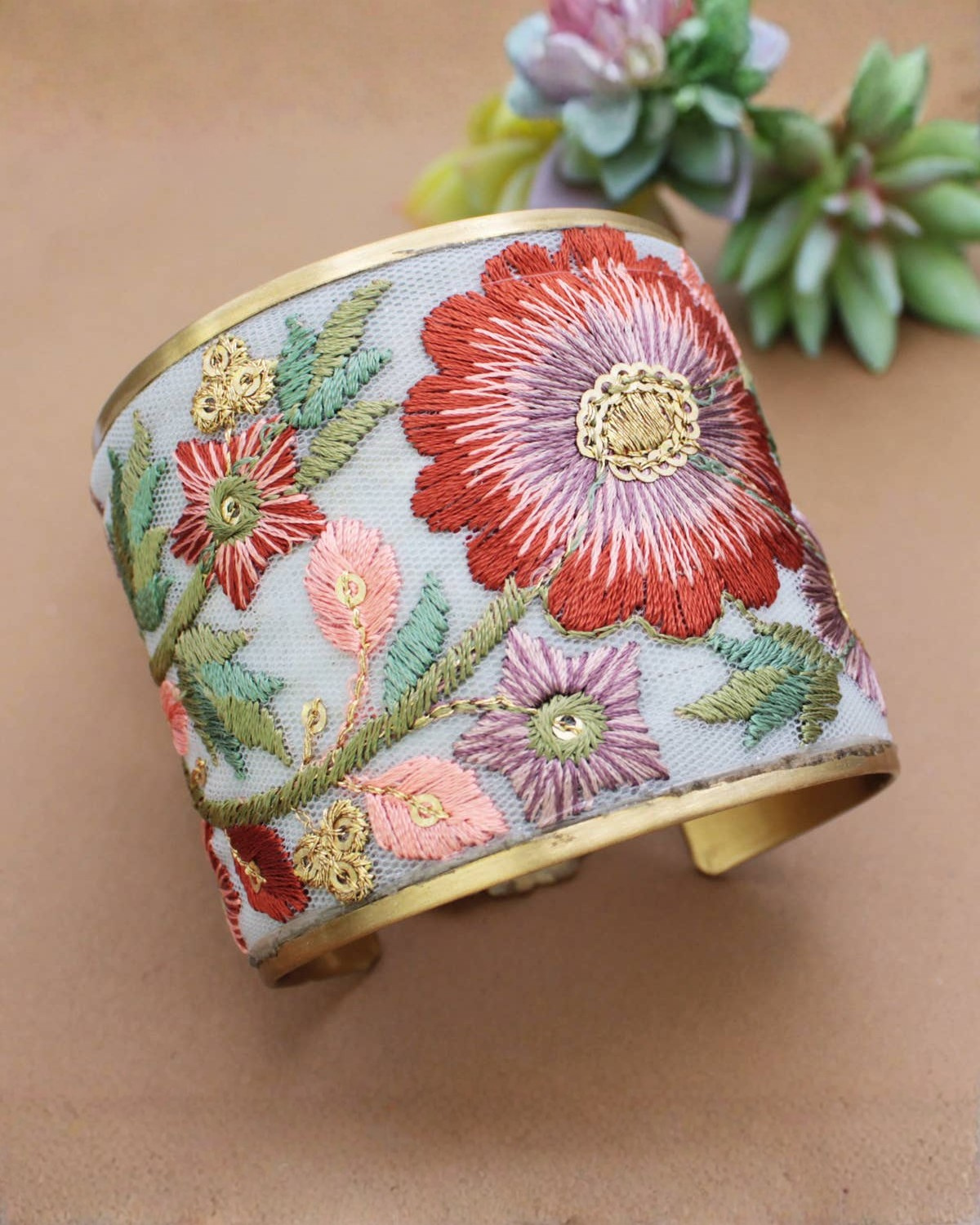 Inspired by vintage florals with a warm seasonal palette, this embroidered cuff bracelet features white fabric adorned with muted pink, rust, and rose-toned flowers. The rich embroidery and wide gold cuff create a bold yet wearable piece that feels both nostalgic and artful.