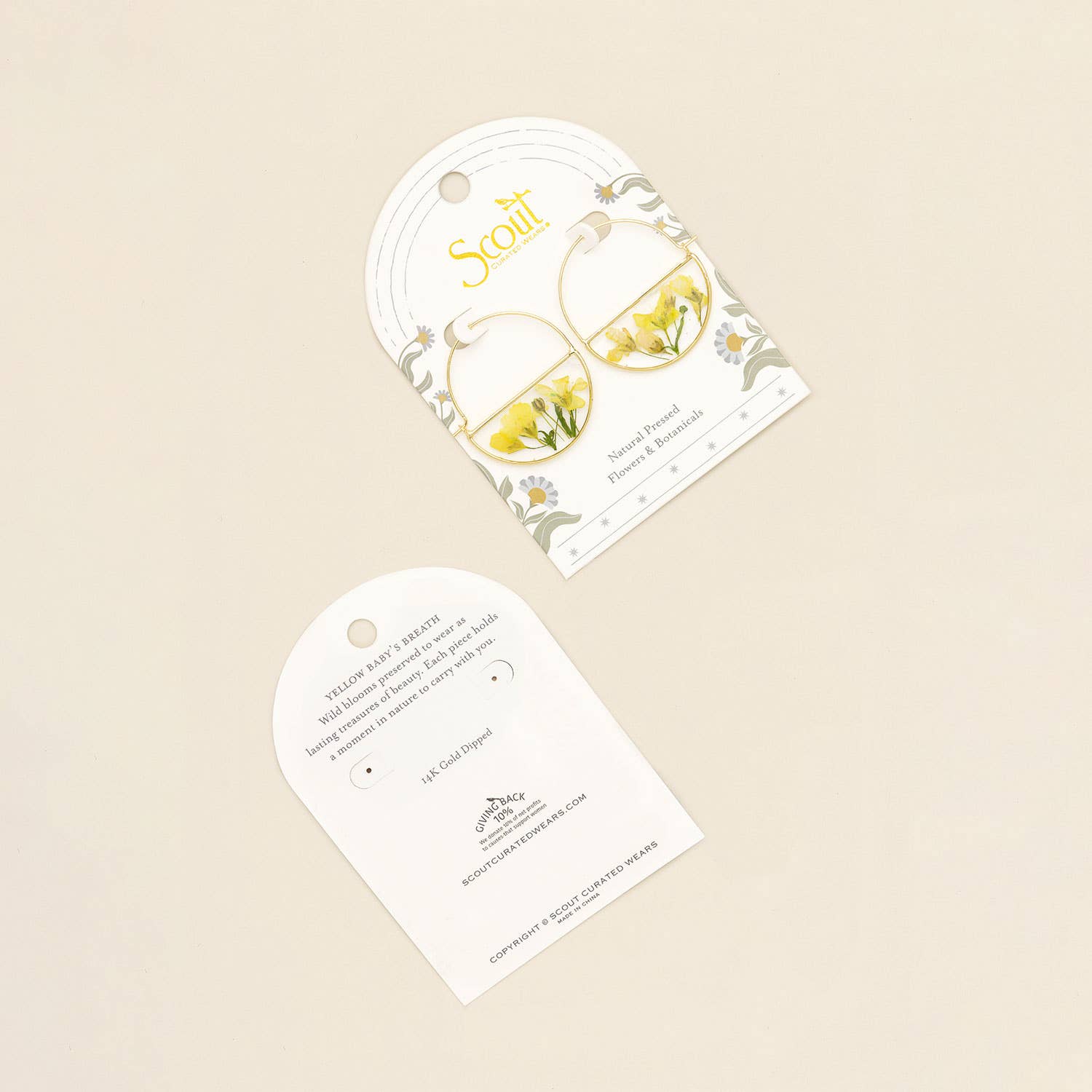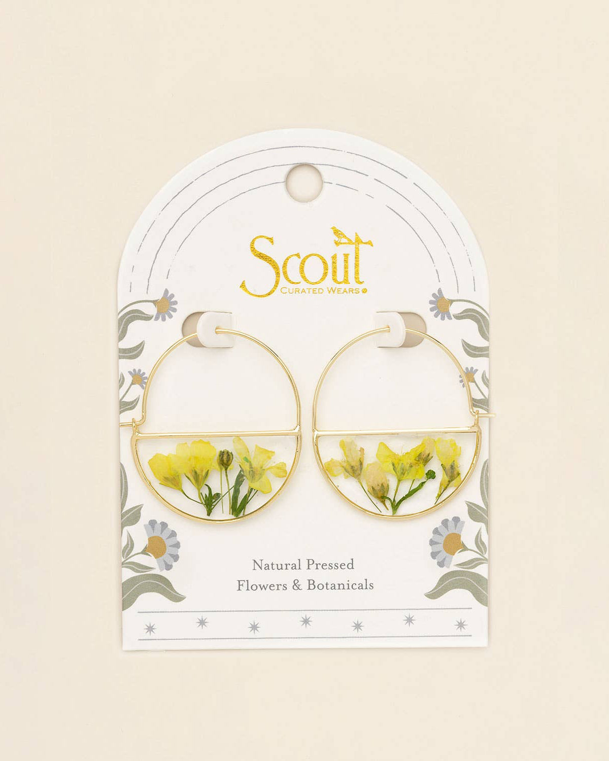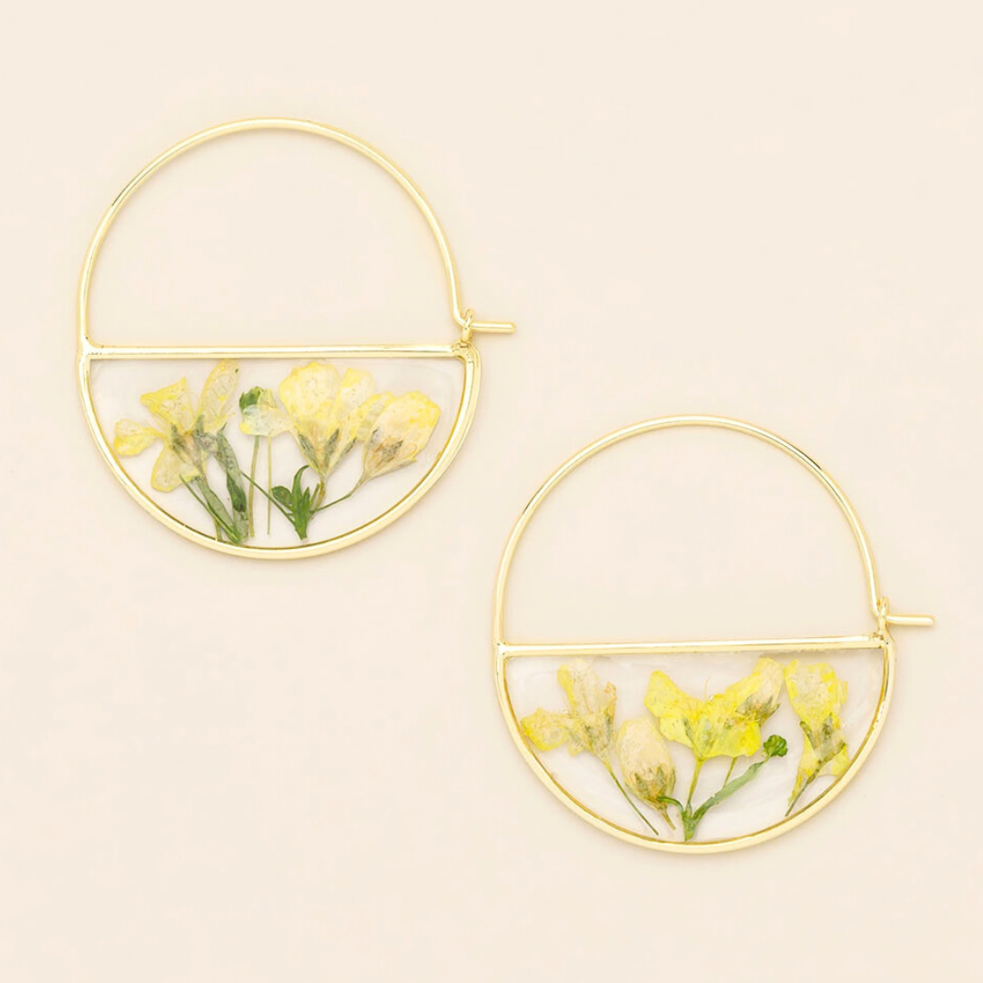 Wild blooms preserved to wear as lasting treasures of beauty; each piece holds a moment in nature to carry with you. Each hoop earring features natural, pressed flowers sealed with 14K gold dipped accents.