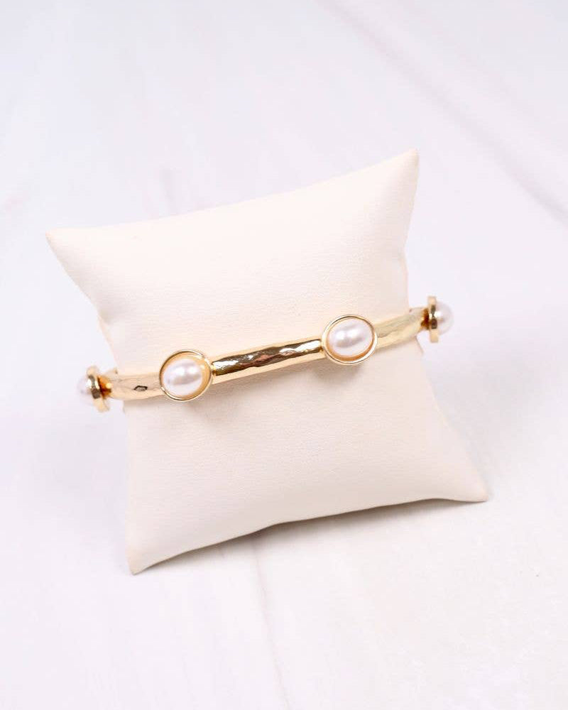This metal bracelet has a shiny, hammered design and is accented with oval pearls. It's a great thinness and stretches to fit most wrists.