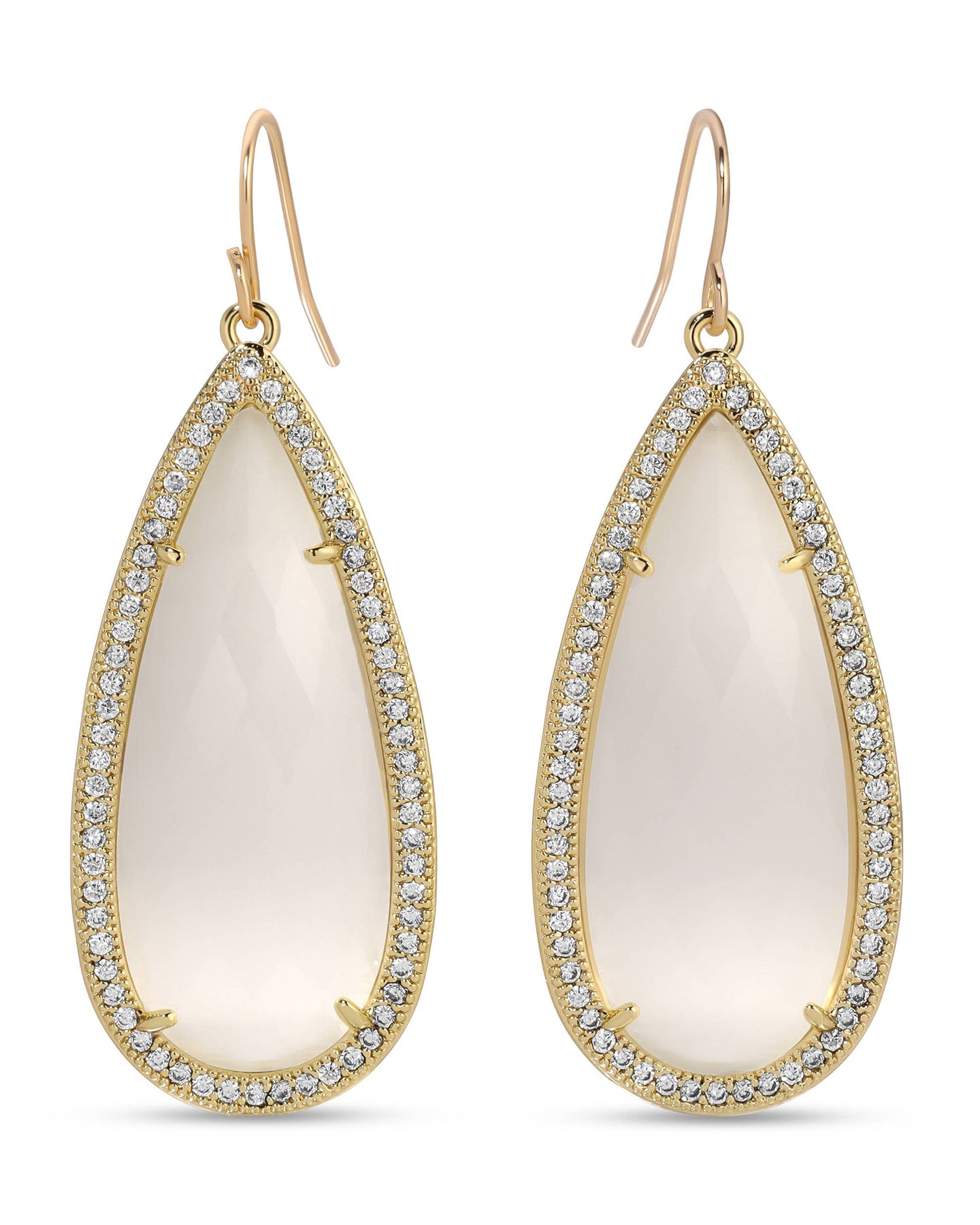 Add a soft shimmer to your style with these elongated white cat’s eye earrings. With a delicate pavé border, they offer graceful movement and timeless appeal.