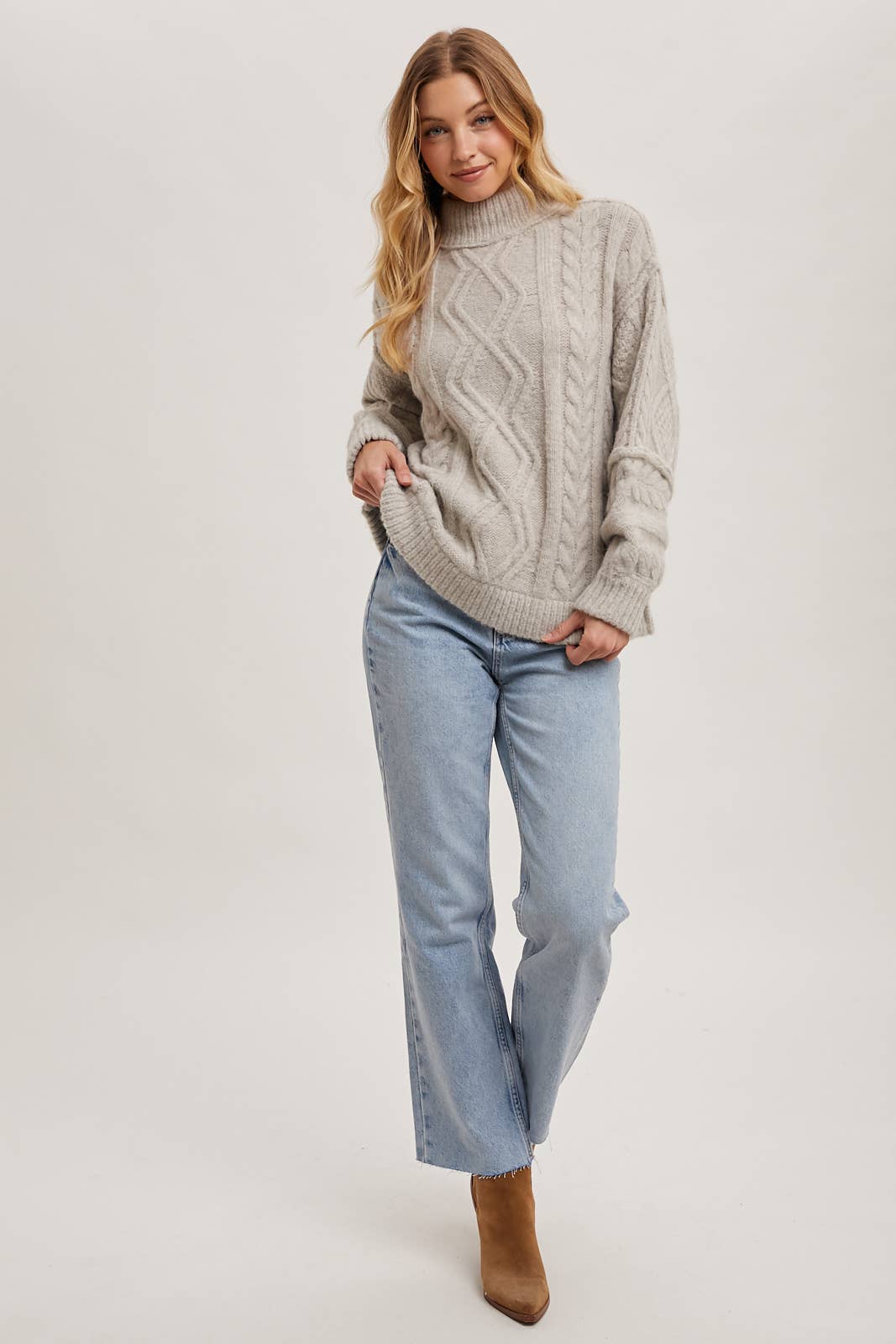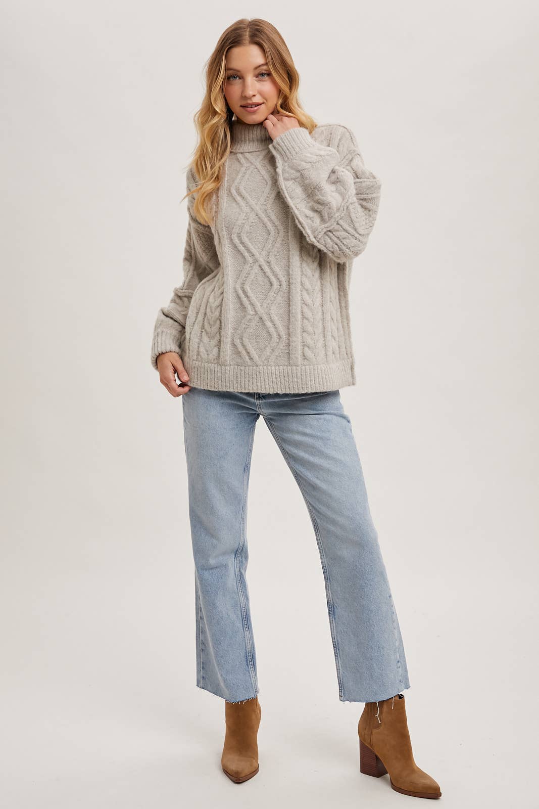 This cozy cable-knit turtleneck brings classic winter style with a touch of effortless polish. Soft, textured, and beautifully detailed, it features intricate cable patterns and a relaxed, slightly oversized fit that feels warm without being bulky. The foldover turtleneck adds extra comfort and makes this an easy favorite for layering, lounging, or dressing up with your favorite denim and boots.