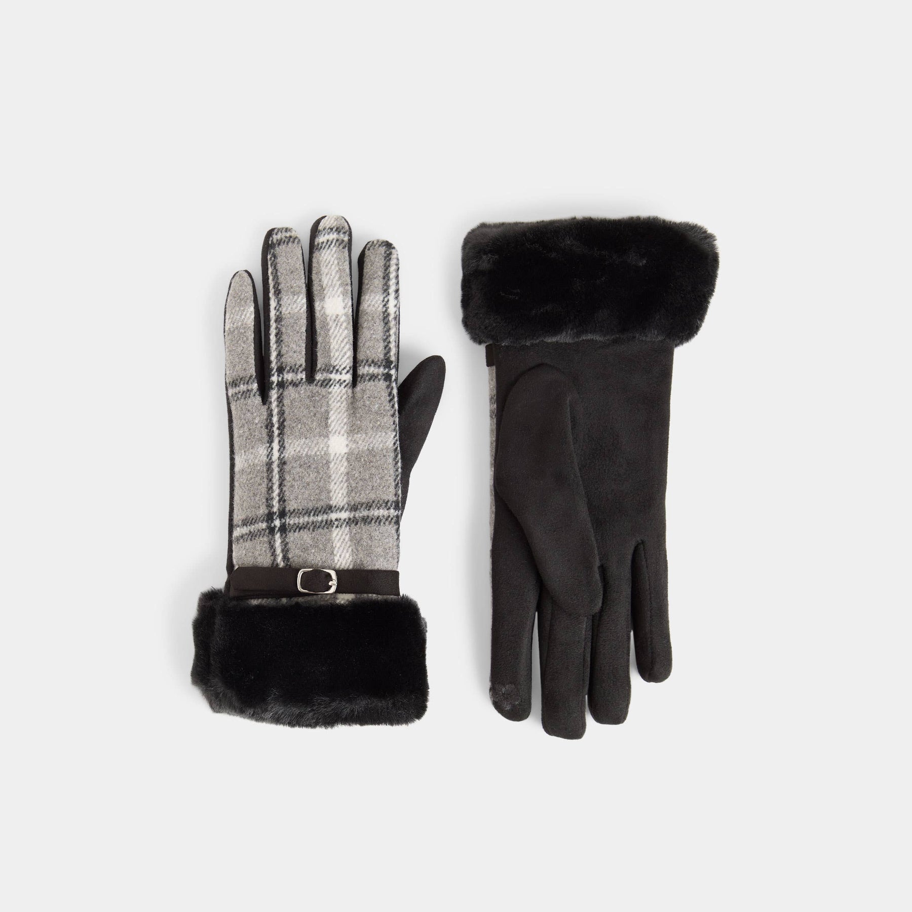 Belted Fur Cuff Plaid Touchscreen Gloves - Black